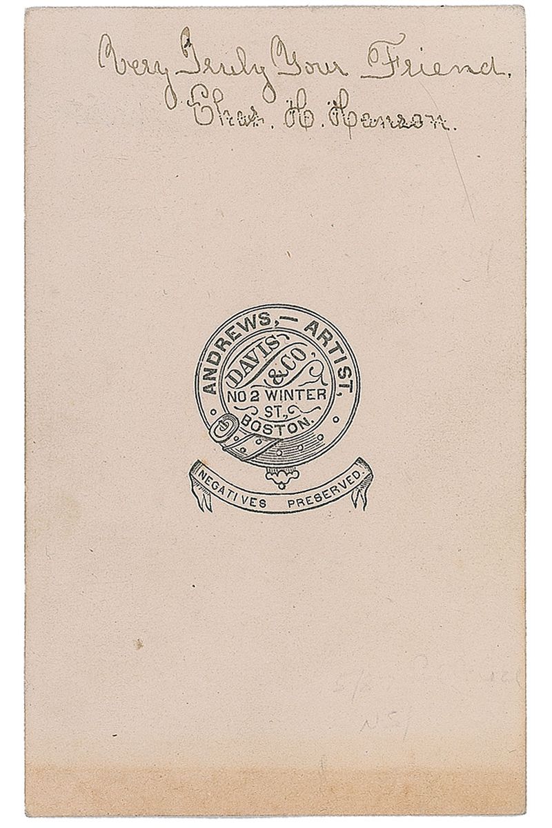 Charles H. Hanson: Original 2.5 x 4 carte-de-visite portrait of Hanson in uniform, signed on the reverse in black ink, “Very truly your friend, Chas. H. Hanson.” Published by Davis & Co. of Boston. In fine condition, with a bit of soiling to top edge.