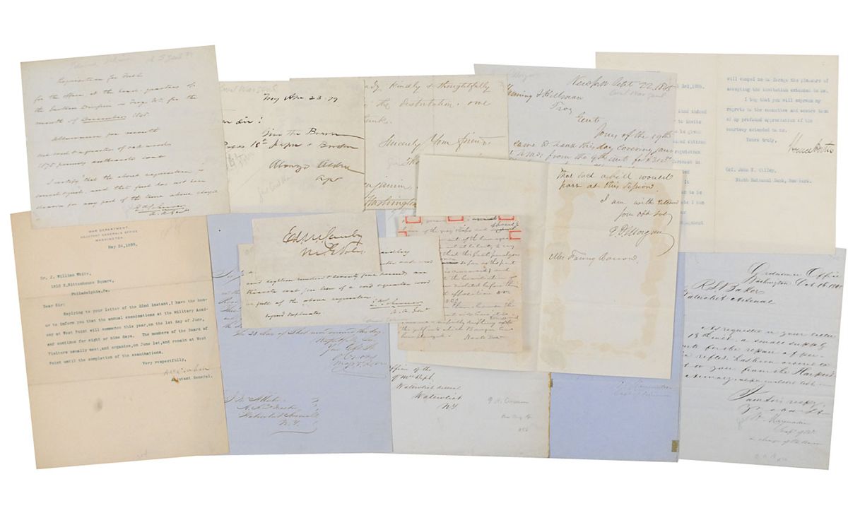 Collection of fourteen items signed by various Union soldiers. Signers include: Edward Canby (signature), Henry Corbin (TLS), Osborne Cross (ALS), Thomas Vincent (ALS), Edwin D. Morgan (2 ALSs), Edmund Schriver (2 ALSs), Alonzo Adams (ANS), Horace Porter (TLS), Neal Dow (ALS), G. H. Crossman (ALS), and William Maynadier (DS and ALS). In overall very good to fine condition.