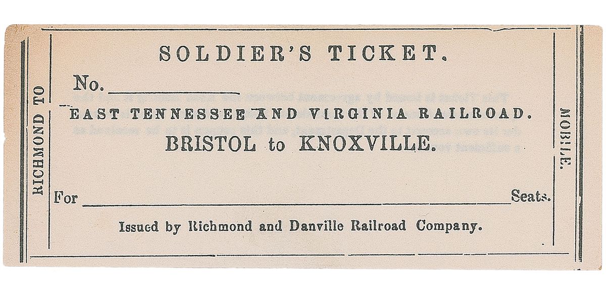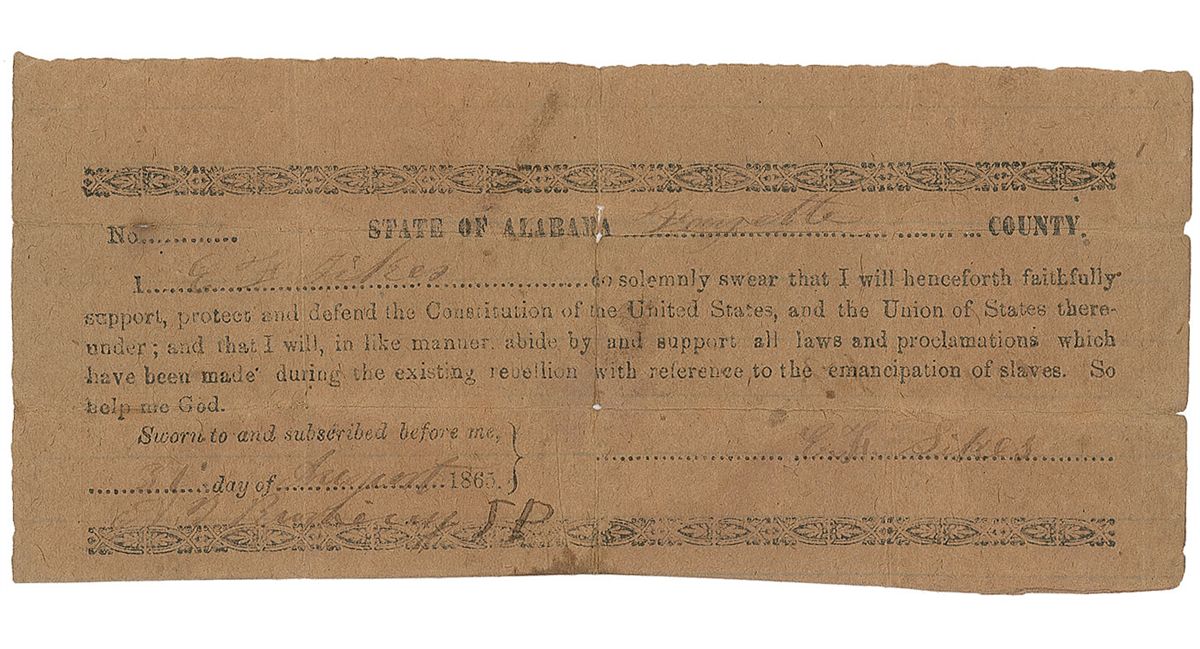 Civil War–dated DS signed “E. H. Sikes,” one page, 7 x 3, August 31, 1865. A state of Alabama oath of allegiance, in part: “I E. H. Sikes do solemnly swear that I will henceforth faithfully support, protect and defend the Constitution of the United States, and the Union of States thereunder; and that I will…support all laws and proclamations which have been made during the existing rebellion with reference to the emancipation of slaves.” Also includes an unused 4.25 x 1.75 soldier’s ticket issued by the Richmond and Danville Railroad Company for a trip from Bristol to Knoxville. Heavy intersecting folds, significant toning, and fading to the oath of allegiance, otherwise very good condition; ticket in fine conditon.
