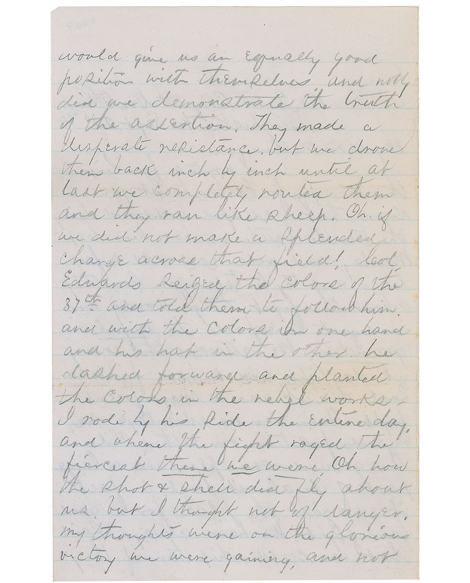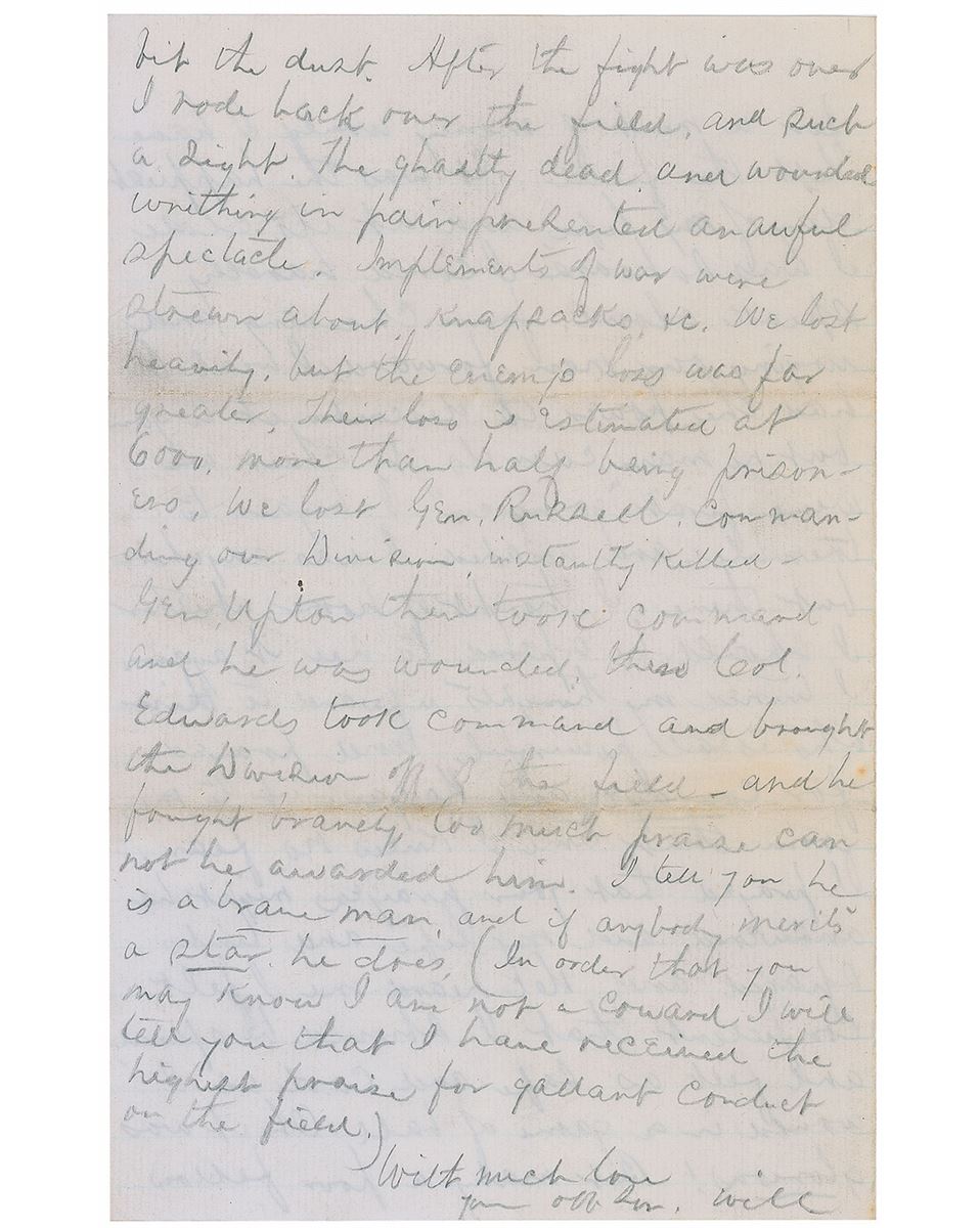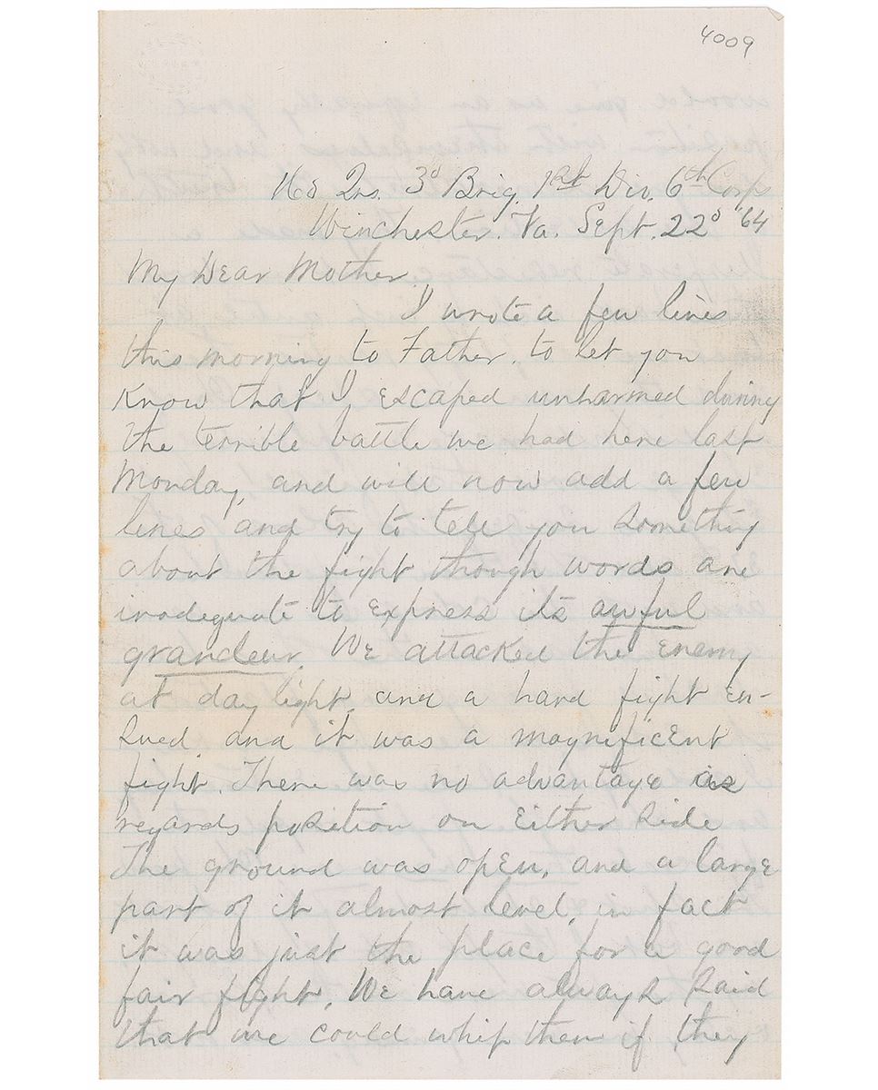 ALS in pencil, signed “Will,” four pages on two adjoining sheets, 5.25 x 8.25, September 22, 1864. Letter by Union soldier William Cooke, written from the headquarters of the 3rd Brigade, 1st Division, 6th Corps in Winchester, Virginia, offering an account of the Third Battle of Winchester. In part: “Col. Edwards seized the colors of the 37th and told them to follow him, and with the colors in one hand and his hat in the other he dashed forward and planted the colors in the rebel works…But many a poor fellow bit the dust. After the fight was over I rode back over the field and such a sight. The ghastly dead and wounded writhing in pain presented an awful spectacle. Implements of war were strewn about, knapsacks, etc. We lost heavily but the enemy’s loss was far greater…In order that you may know I am not a coward I will tell you that I have received the highest praise for gallant conduct on the field.” In fine condition, with light soiling and toning at folds. Accompanied by the original mailing envelope. Fought in Winchester on September 19, 1864, the battle proved an important victory for the Union and a humiliating defeat for Jubal Early’s Confederate forces.