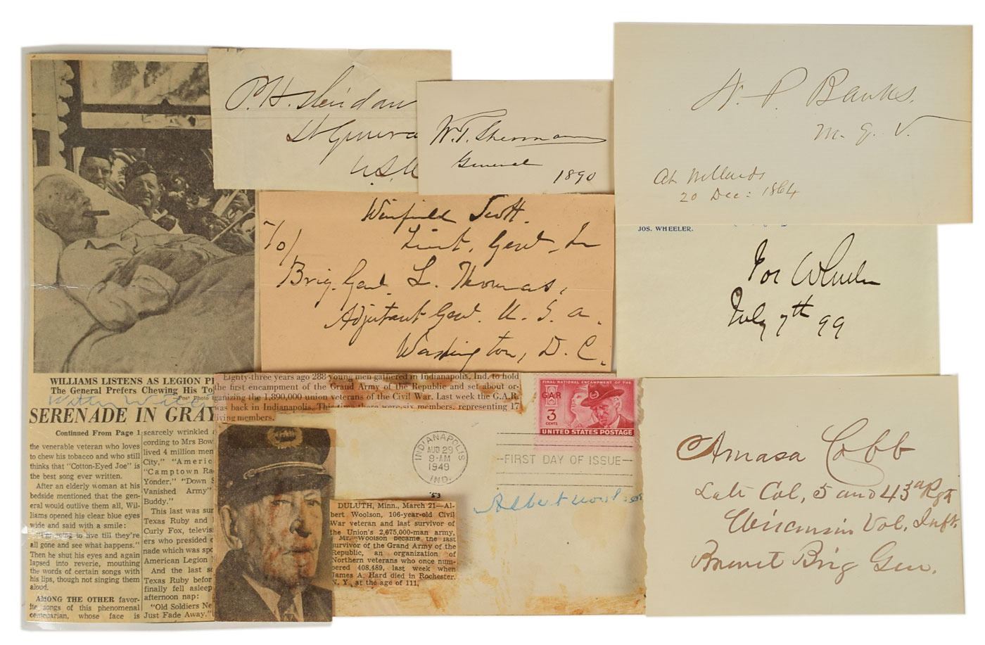 Collection of eight items, consisting mostly of slips or cards, ranging in size from 3 x 1.75 to 3.5 x 8.5, each signed in ink by a notable Civil War hero, including: Amasa Cobb, Nathaniel P. Banks, Winfield Scott (ins), Philip Sheridan, William T. Sherman, Joseph Wheeler, Walter Williams (newspaper article), and Albert Woolson (FDC). In overall very good to fine condition, with staining to the Woolson and the Williams entirely laminated.
