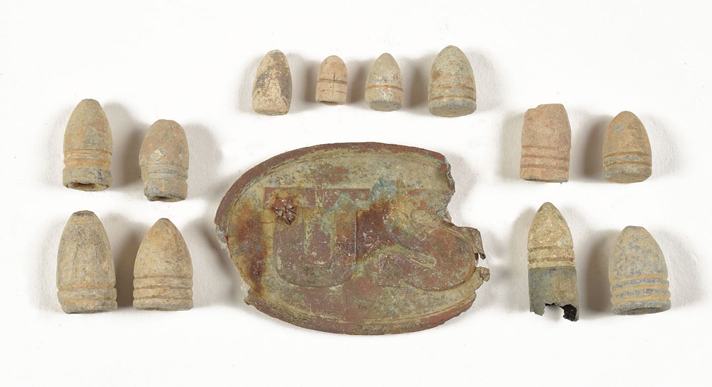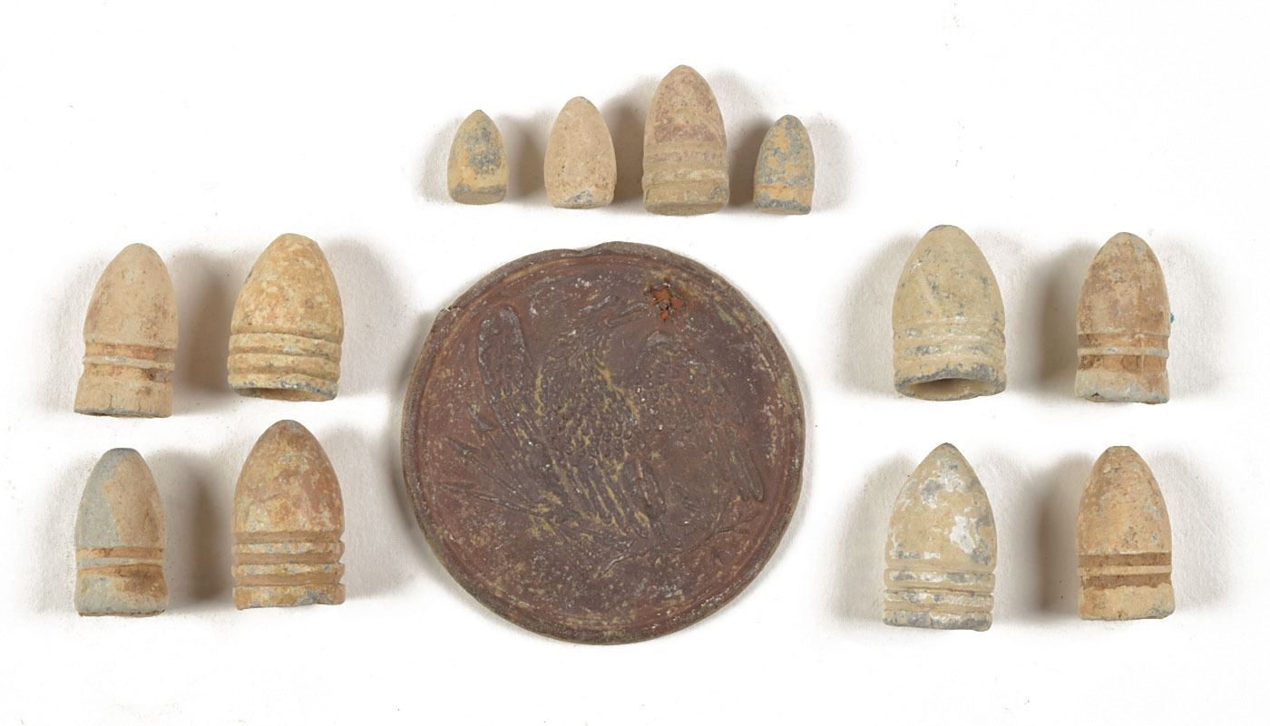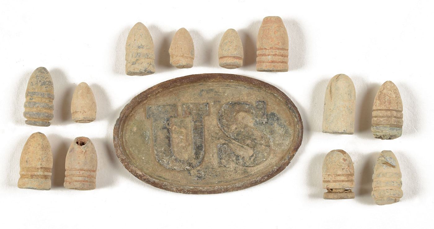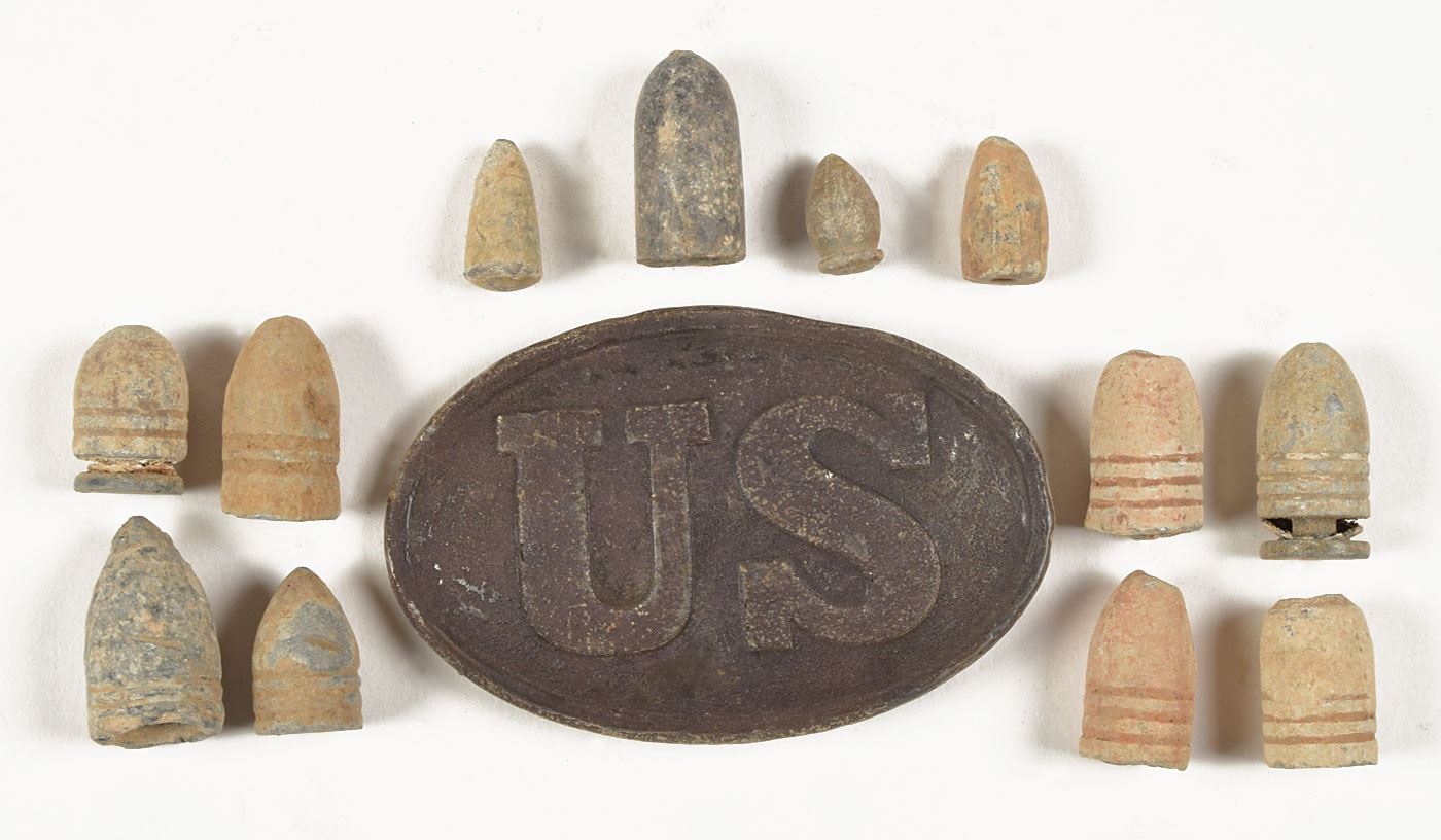 Collection of relics recovered from Civil War battlefields, including: a US belt buckle with arrow hooks, measuring 3.5? x 2.25?; a circular breastplate, 2.5? in diameter, depicting the American eagle; a US cartridge box plate, measuring 3? x 2.25?, with hooks missing and portions missing at left and right, possibly shot off; a US cartridge box plate, 3? x 2.25?, with hooks missing; and more than 40 bullets, various sizes and caliber, recovered from various Civil War battle sites.