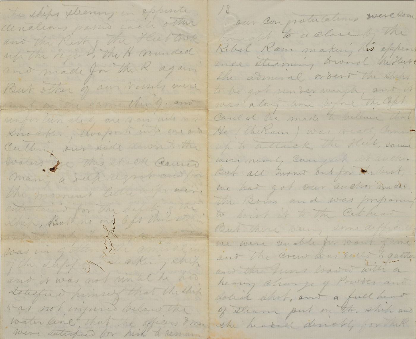 The remaining pages represent a moment-by-moment eyewitness retelling of the engagement, in part: "As ordered we had 14 vessels and 4 Iron Clads. The Iron Clads had the inside or starboard side position, they were to engage the Rebel Ironclads…The Gulf into Mobile Bay covered more than 500 infernal machines destined to destroy our noble vessels, by their books and papers we know they counted on blowing us to pieces…but their torpedoes was and ever will be looked upon as a cowardly contrivance to get clear of a fair and open fight and the Admiral had intended to lead in the fleet but as the Brooklyn Capt Alden had a torpedo cutter on her blow and had four funs that she could train ahead by persuasion he gained permission to lead.” At this juncture, the seemingly impregnable monitor Tecumseh, in an effort to keep the approaching CSS Tennessee in view, steered into a minefield, struck a torpedo, and sunk in less than a minute. “The Gallant Capt. [Tunis Craven] and his vessel was no more and one had just time to say she is sinking ere she was lost sight seeing this and supposing his ships running on to a nest of there terrible machines the Gallant Alden hesitated backed his vessel and stood aghast.” Peril and confusion prompted the USS Brooklyn, which led the second column, to halt and Captain James Alden to request orders before moving ahead. Determined to keep his flagship in forward momentum, Farragut ordered the Hartford around Brooklyn and into the minefield with his famous order of ‘Damn the torpedoes.’ His gamble that the submerged torpedoes would be of no consequence proved correct, and erelong his fourteen warships passed through unmolested. “Everyone asked why does the B [Brooklyn] stop, and I am sure disaster would have followed if the Gallant Admiral had not asked if there was room to pass the Brooklyn & on being answered in the affirmative gave the order for the H to steam ahead and gaily was the order executed and the Rebels soon left their guns and we cared nothing further from the fort & battery.” Brook proceeds to detail the succeeding hours of combat between Union forces and the Confederate Navy: “The Metacomet who with one shot killed nine and wounded seven and compelled her to haul down the rebel flag to the glorious Stars And Stripes, the bold act of the admiral and the daring fighting of the Hartford inspired the whole fleet…The Dear Old Flag never looked so beautiful as that morning after the terrible two hours of hard fighting. Oh it was a grand sight…Our gallant vessels were now alternately ramming and pouring broad side after BS…The Manhattan had succeeded in giving him one good fifteen shot which crushed in his casement and not one of our vessels being injured by him…The ships steaming in opposite directions passed each other and the rest of the fleet took up the fight. The H rounded and made for the R[am] again but other of our vessels were bent on the same thing and unfortunately one ran into us knocking two ports into one and cutting our side down to the waters edge…our gallant vessels were now alternately ramming & pouring broadside after BS into the R and one of our monitors laying under his stern pouring in eleven inch also, the Manhattan had succeeded in giving him one good fifteen shot which crushed in his casement and not one of our vessels injured by him & seeing himself knocked to pieces his ports being knocked out of kilter men being killed & the chief traitor wounded that he hoisted the white flag in token of submission, and thus ended the fight with the Ram. Rather a free fight more like a fox and pack of hounds than anything…We commenced immediately to look out for the wounded and killed…in the quiet of peace than in that morning of excitement and bloodshed, no one seemed to think of life that day and then get the gift of it but a duty not all painful and many felt it was only a moments transit from Earth To Heaven…We are now therefore in complete possession of Mobile Bay…Thanks to God for the Victory." In fine condition. An exhaustive, endlessly fascinating account of the Battle of Mobile Bay.