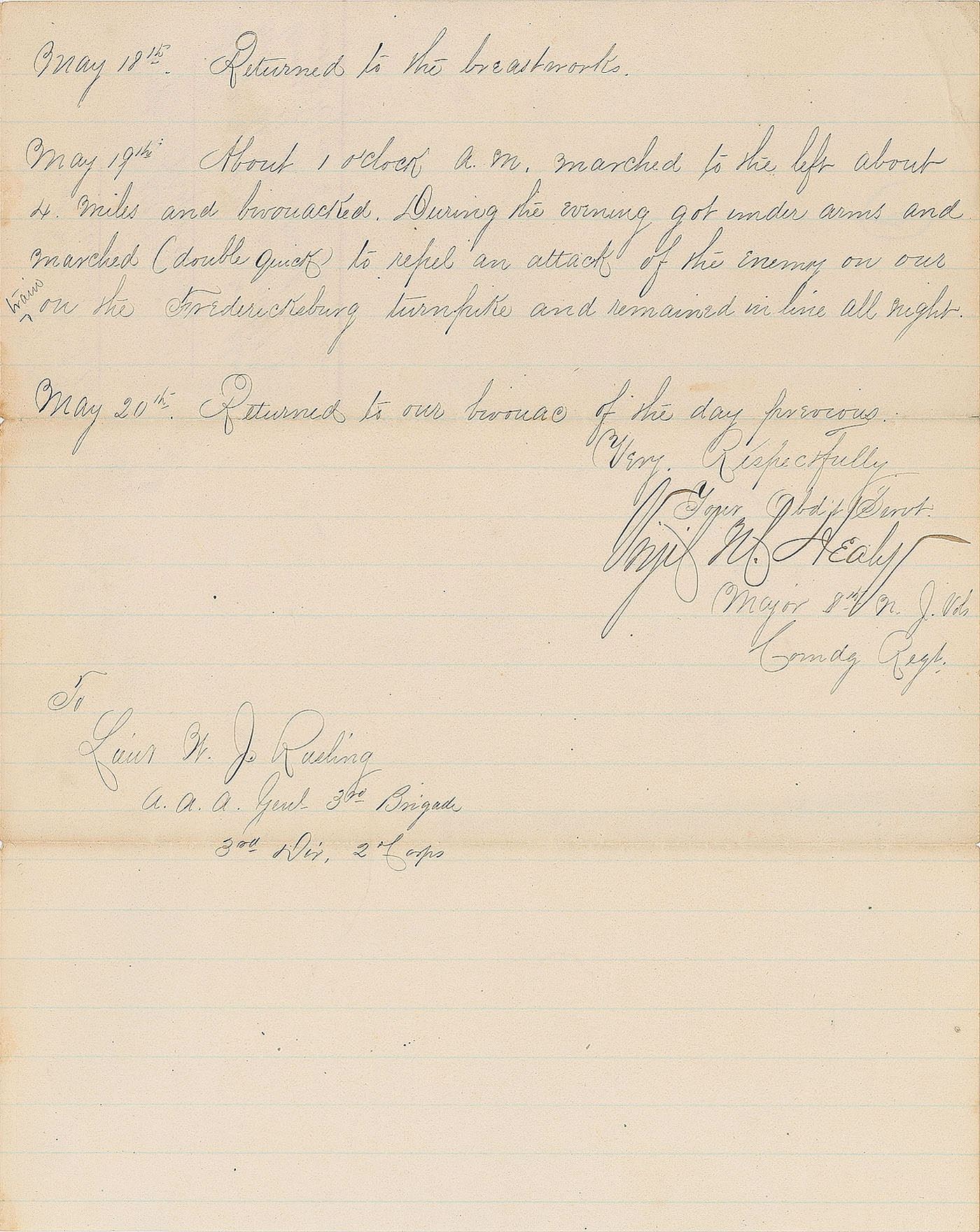 Civil War-dated DS, signed “Virgil M. Healy,” three pages on two adjoining sheets, 7.75 x 9.75, August 8, 1864. Battle report issued to W. J. Rusling, written from "Head Quarters 8th N. J. Vols., Camp near Petersburg, Va.," in full: "In compliance with Special order 209, Hd. Qrs. Army of the Potomac, dated August 5th 1864, I have the honor to report the following as the part taken by this regiment during the second Epoch of the campaign, 'including the march to Spotsylvania and the operations in front of that place.' May 8th Left bivouac at Chancellorsville and escorted the Train to Falls Church and bivouacked. May 9th Joined the brigade at Todds Tavern, and march to the left about 2 miles and threw up breastworks. In the afternoon the regiment left the breastworks and marched to the right about 3 miles and threw up breastworks across the Kitoklow Road and remained until 4 A.M. May 10th At 4 A.M. left the breastworks and marched to rejoin the Corps, and took up a position on the night of the Brown House, near Spottsylvania Court House and made a connection with the left of the 6th Corps about 9 AM. May 11th The regiment went on Picket along the Ny. River and connected with the right of the 9th Corps. May 12th About 5 A.M. and soon after the storming of the Rebel works, the regiment advanced across the Ny, and captured 2 officers and 40 men (Rebels) straggling through the woods and send them to the Provost Marshall, carried some 30 wounded men to the rear and had them taken to the hospital one man wounded on picket. May 13th & 14th On Picket. May 15th Relieved from Picket and rejoined the Brigade and connected with the right of the 9th Corps in the breastworks and was shelled by the enemy during the day. May 16th Lay in the breastworks all day and strengthened them during the night, and built traverses. May 17th Moved to the rear about 12 mile and had an inspection of the regiment. May 18th Returned to the breastworks. May 19th About 1 oclock A.M. marched to the left about 4 miles and bivouacked. During the evening got under arms and marched (double quick) to repel an attack of the enemy on our train on the Fredericksburg turnpike and remained in line all night. May 20th Returned to our bivouac of the day previous." In fine condition.