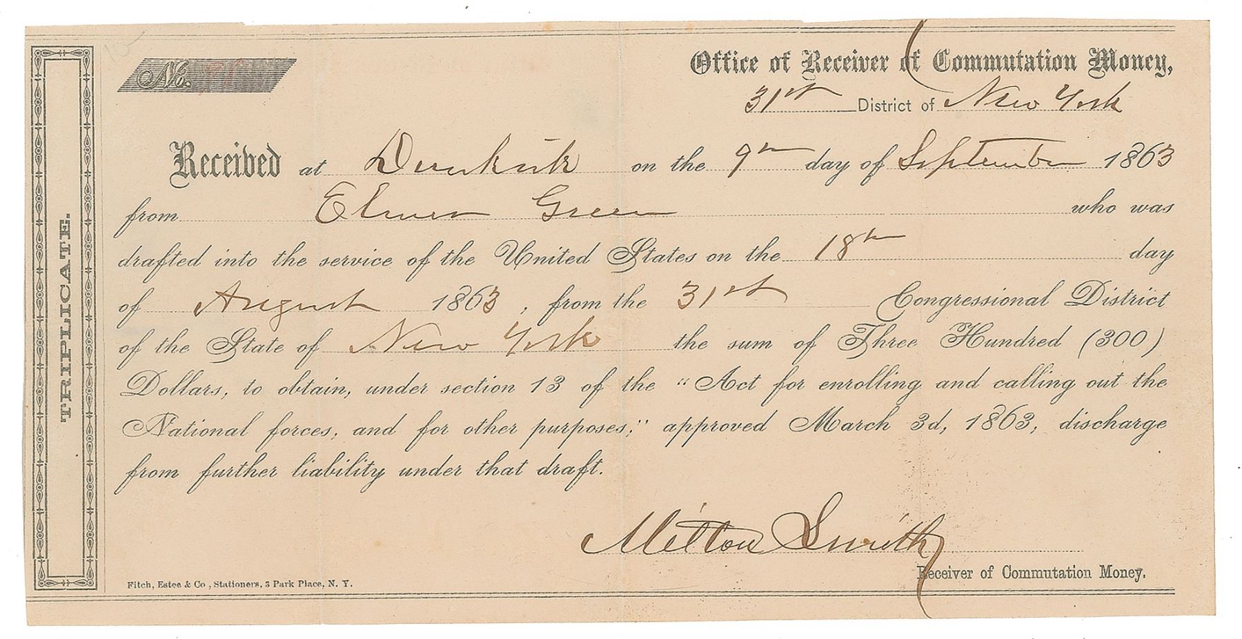 Civil War–dated partly-printed DS, signed “Milton Smith,” one page, 8.5 x 4.25, September 9, 1863. Receipt declaring that a citizen has paid the $300 bounty during the war to avoid serving, in part: "Received…from Elmer Green who was drafted into the service of the United States…the sum of Three Hundred (300) Dollars, to obtain…discharge from further liability under that draft." In very good to fine condition, with light creasing, and three vertical folds.