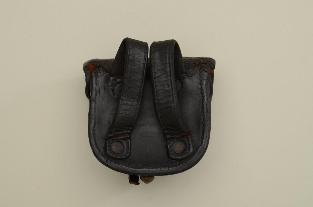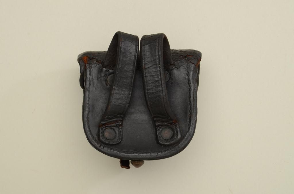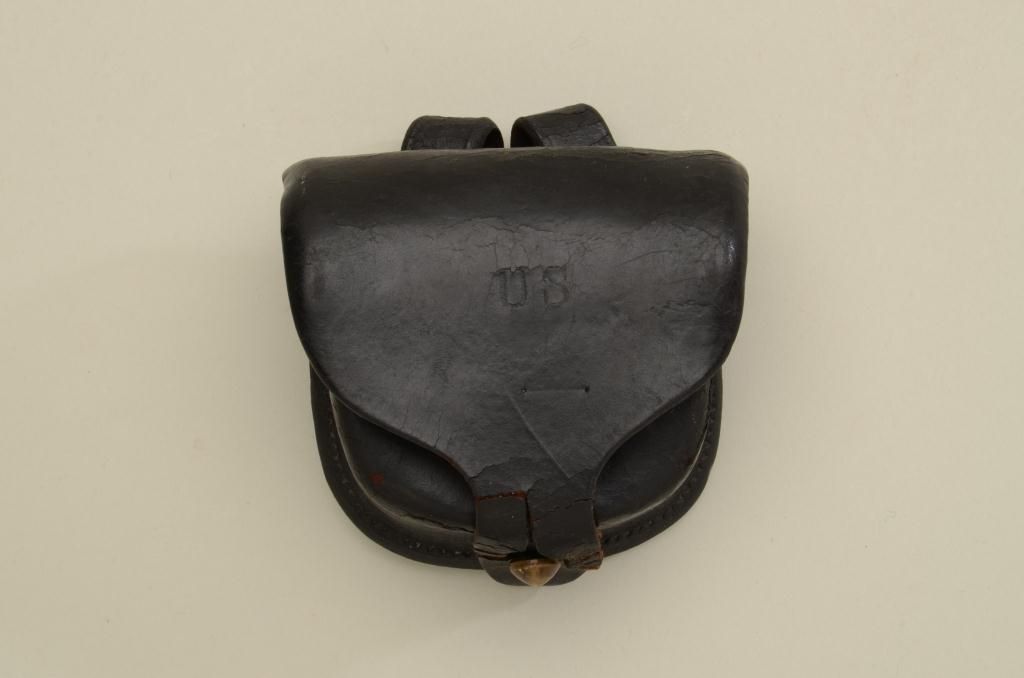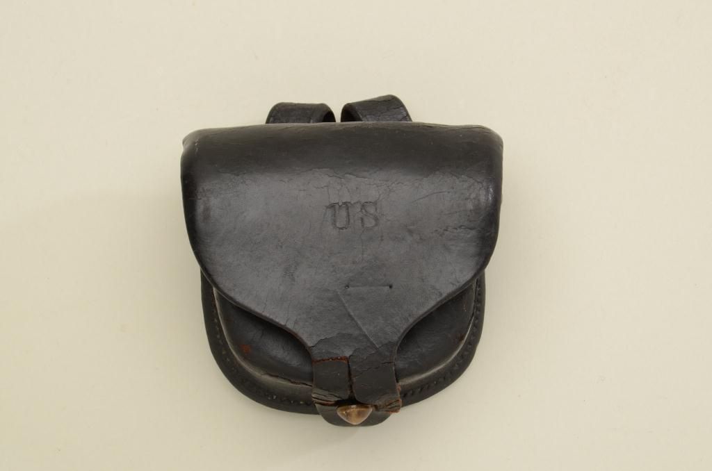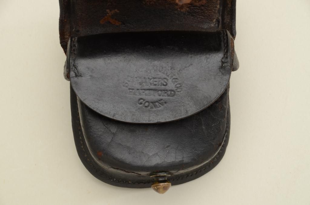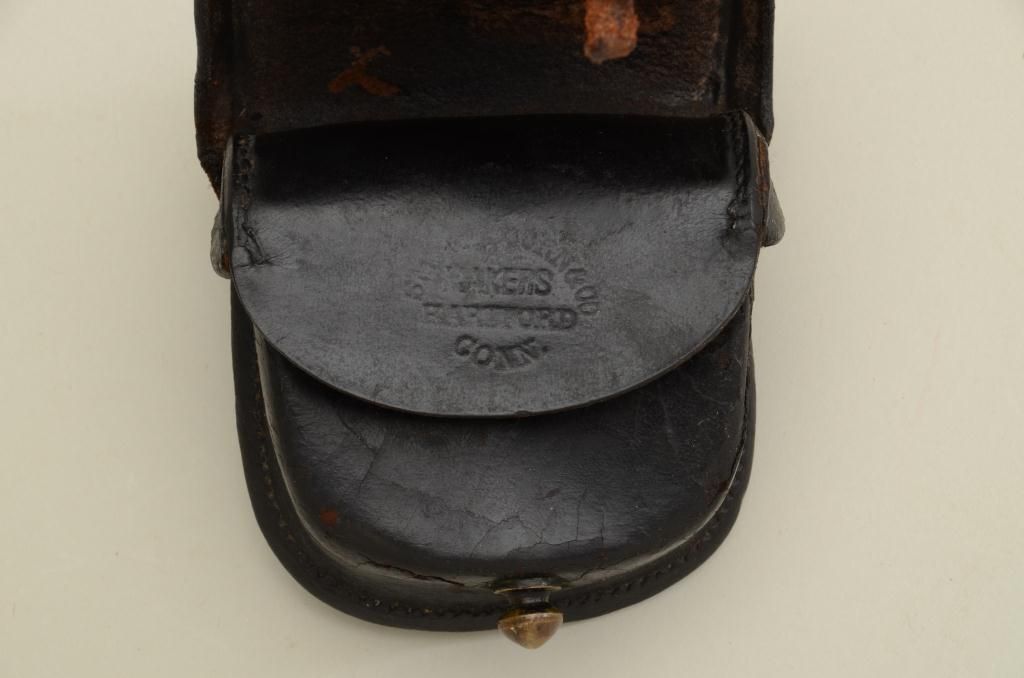 Civil war cap pouch with imprinted US on front marked on interior flap SM ___bourn, Makers, Hartford, Conn. Retaining sheepskin lining but no nipple pick. Tab pull shows tear and belt loops retained. Good condition. Est.: $150-$300.