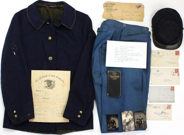 includes hard to find enlisted mans uniforms, this particular uniforms is comprised of Kepi, Jacket, Trousers, original discharge papers, 3) family tin type photos and misc letters, 1899 note book listing his address as the Soldiers Home Milwaukee Wisconsin as of 1915. Est. 700-1400