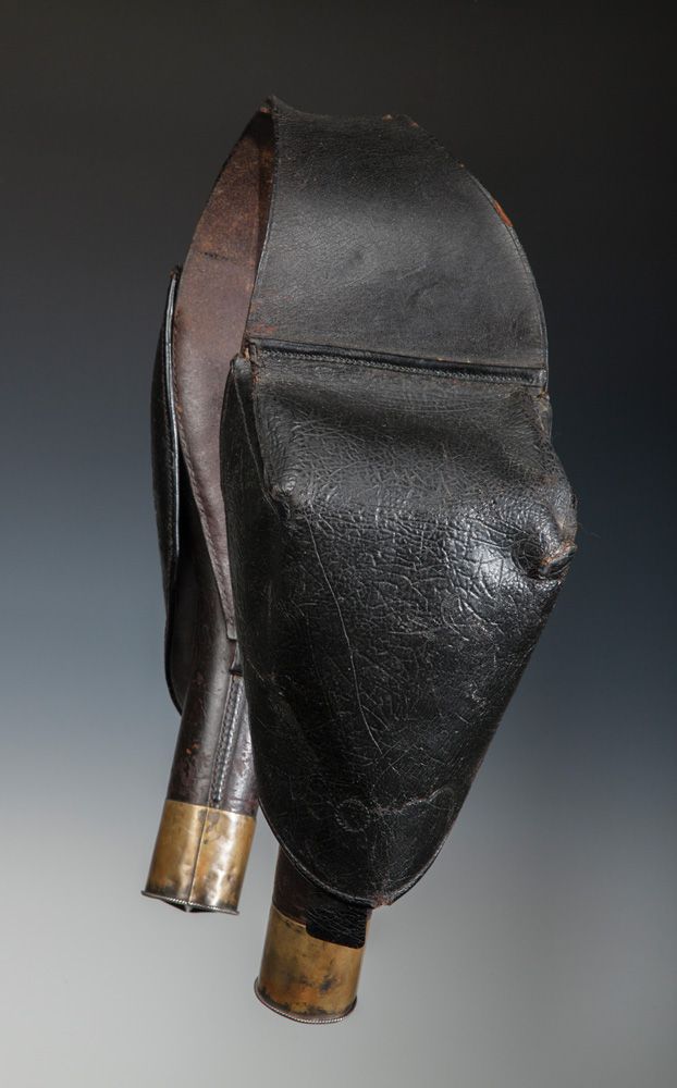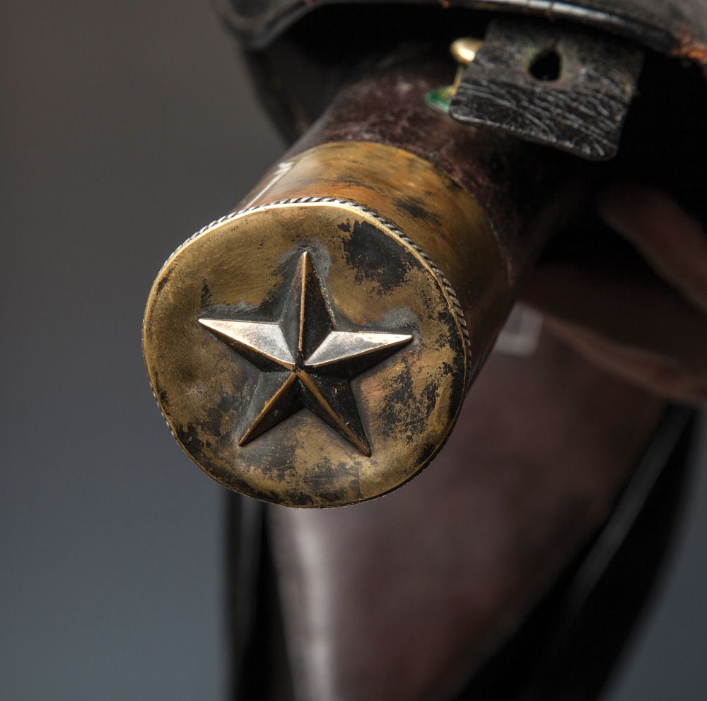 Civilian Pommel Holsters with Texas Star. Double Pommel Holsters for Single Shot Percussion Pistols, probably 1830s through 1850s. Covers are original and may have been tarred for protection from rain; brass caps at end of tubes decorated with 5 point-stars; double rows of stitching forming an oval on cross strap, may have been reinforcement or device to secure holsters. Leather is in excellent condition throughout, brass has mellow aged finish, each holster bears its own cartridge box under flaps, still has original closure straps, one tie down loop missing.