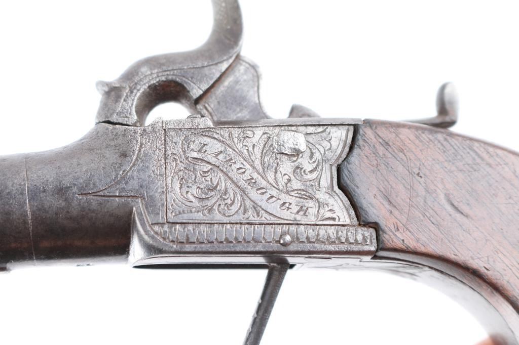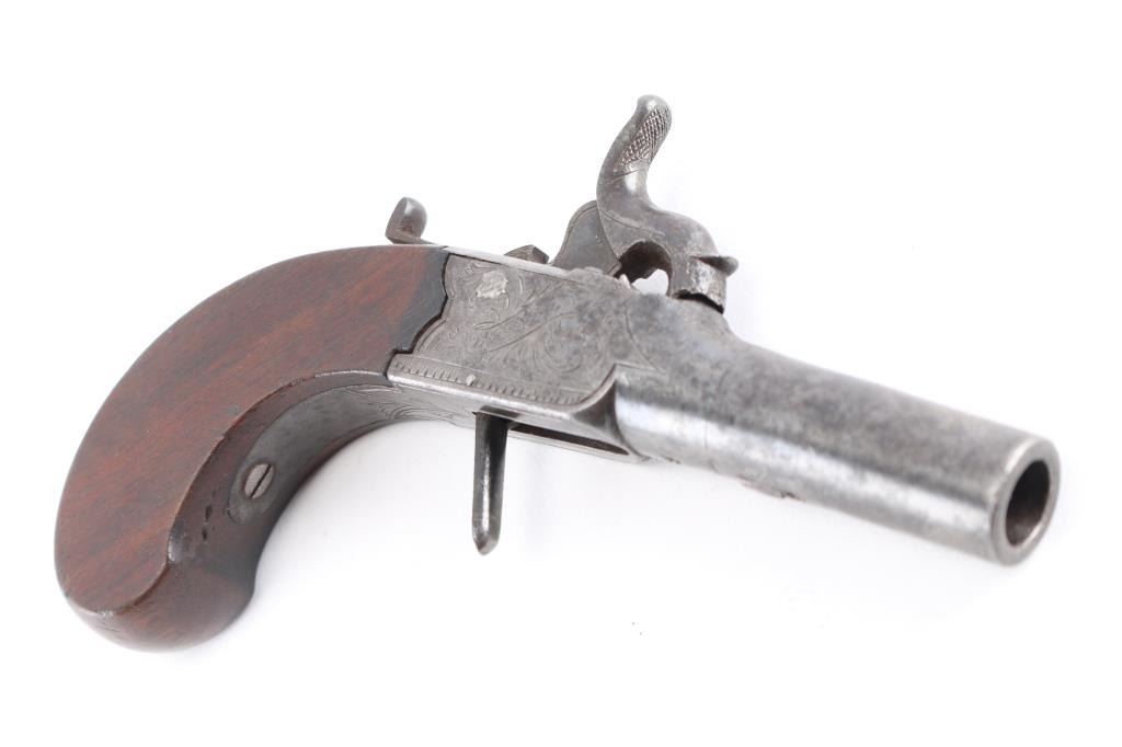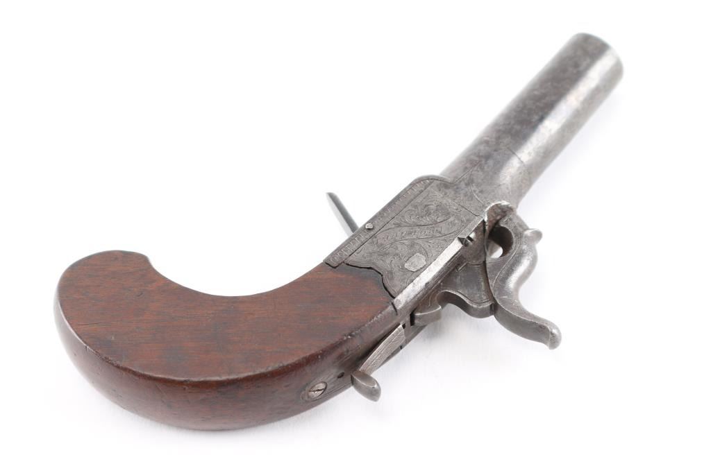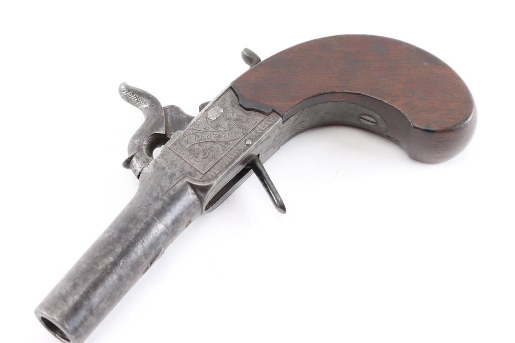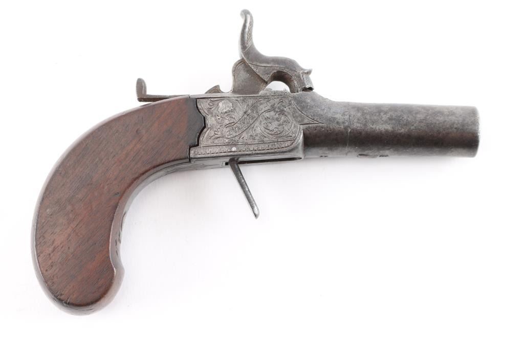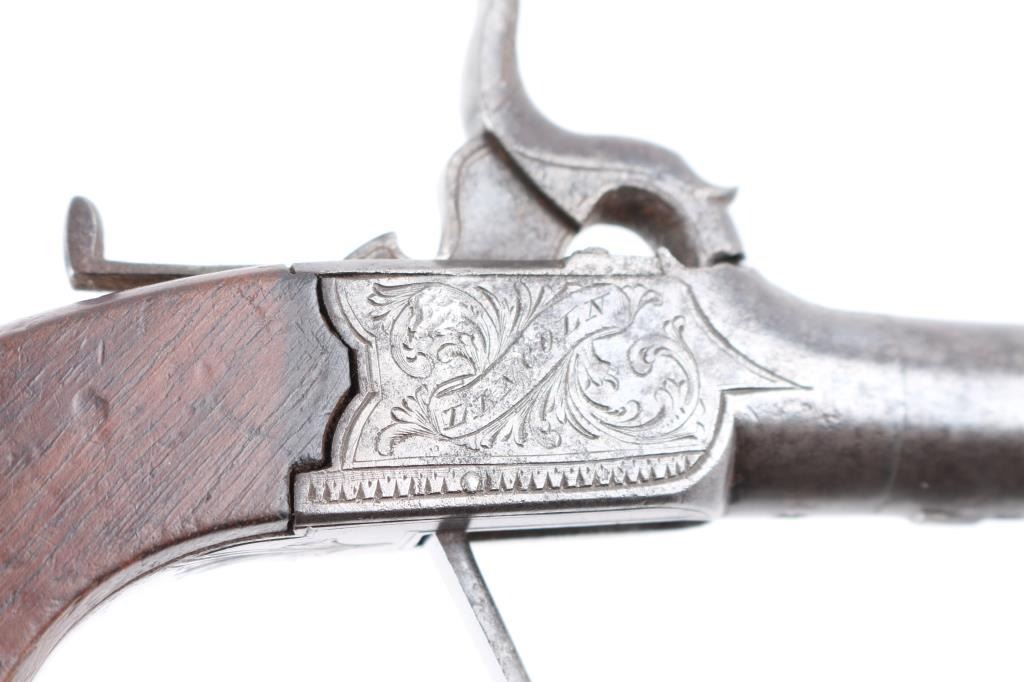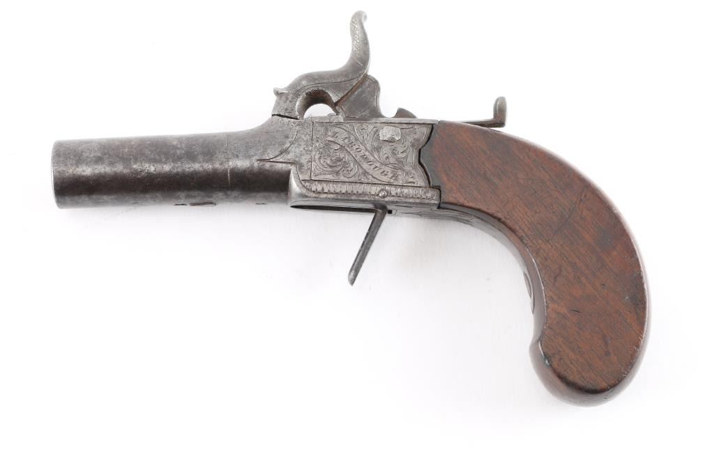 "Clabrough", "Lincoln" signed folding trigger percussion muff pistol. Rare example before M. Clabrough moved to Birmingham about mid 1840's. From Larry Shelton collection, author of J.P. Clabrough Birmingham, maker. Consigned by his estate. Nicely engraved in good condition w/ bag shaped slab sided grip, center hammer, folding trigger. 6-1/4" overall, w/ 40plus caliber smooth BBL. Gray patina w/ traces of finish. Minor erosion and surface pitting. Action works. Wood stock good to very good.