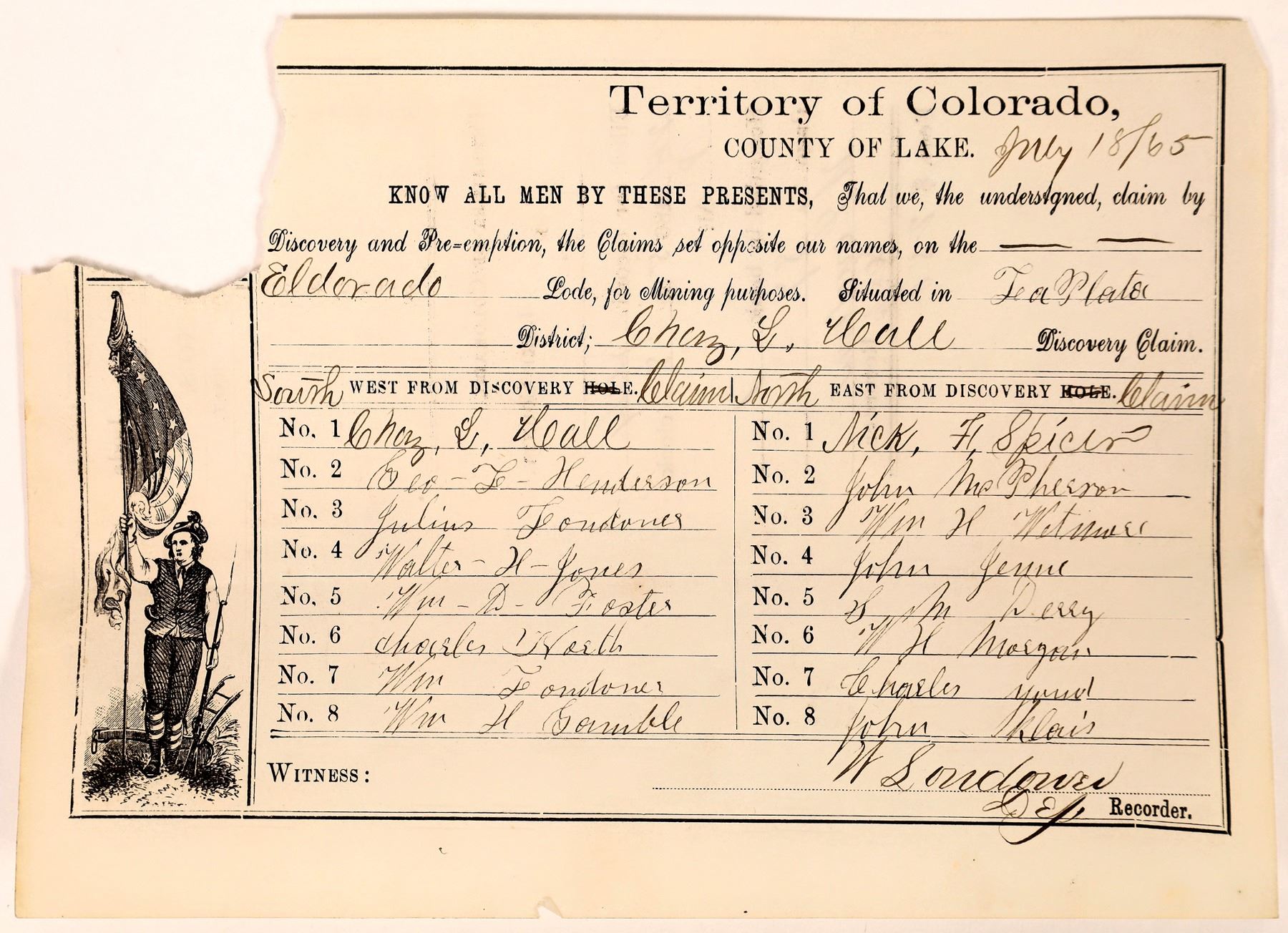 Very rare territorial claim document for Lake County dated July 18, 1865. Charles L. Wall discovery claim. Eldorado Lode. La Plata District. Lists 8 claims and names for south west from discovery site and 8 claims and names for south east from discovery claim. Signed by the deputy recorder. Vignette on the left side of a man holding up an American flag. Upper left corner missing. Measures approx. 7 " x 5." Reverse has notations from the recorder. Light toning. Vey early Colorado mining document. La Plata District Colorado 1865