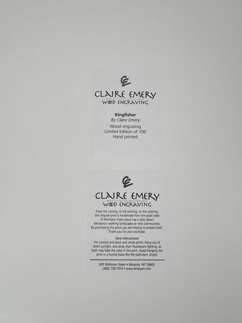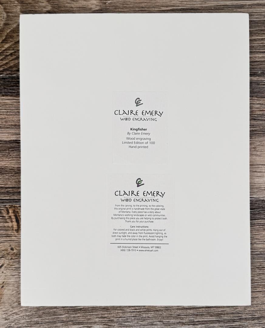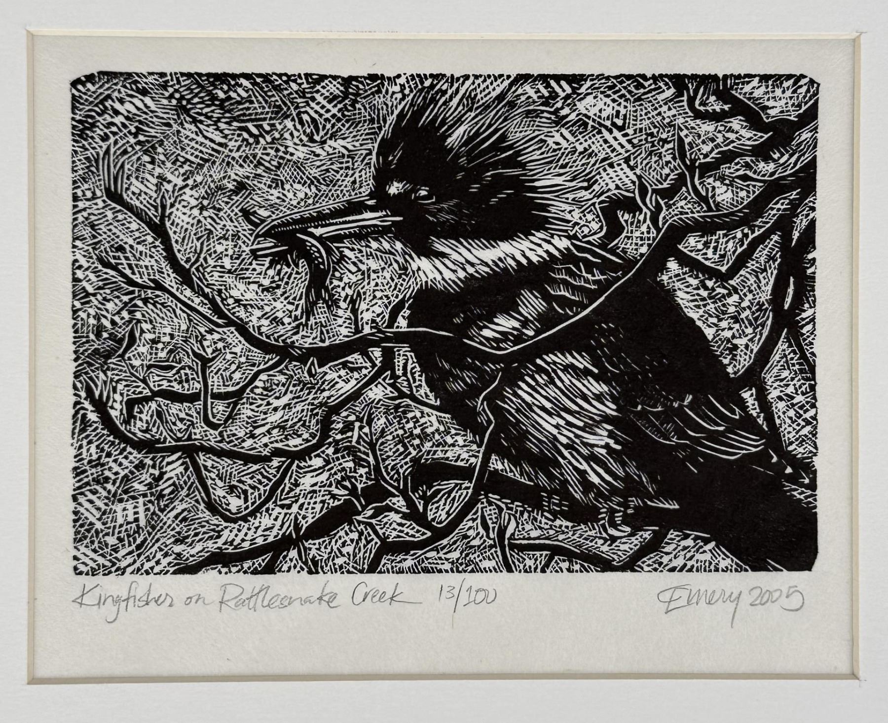 Title is Kingfisher on Rattlesnake Creek. Wood Engraving. 11" by 14" matted. 13 of 100