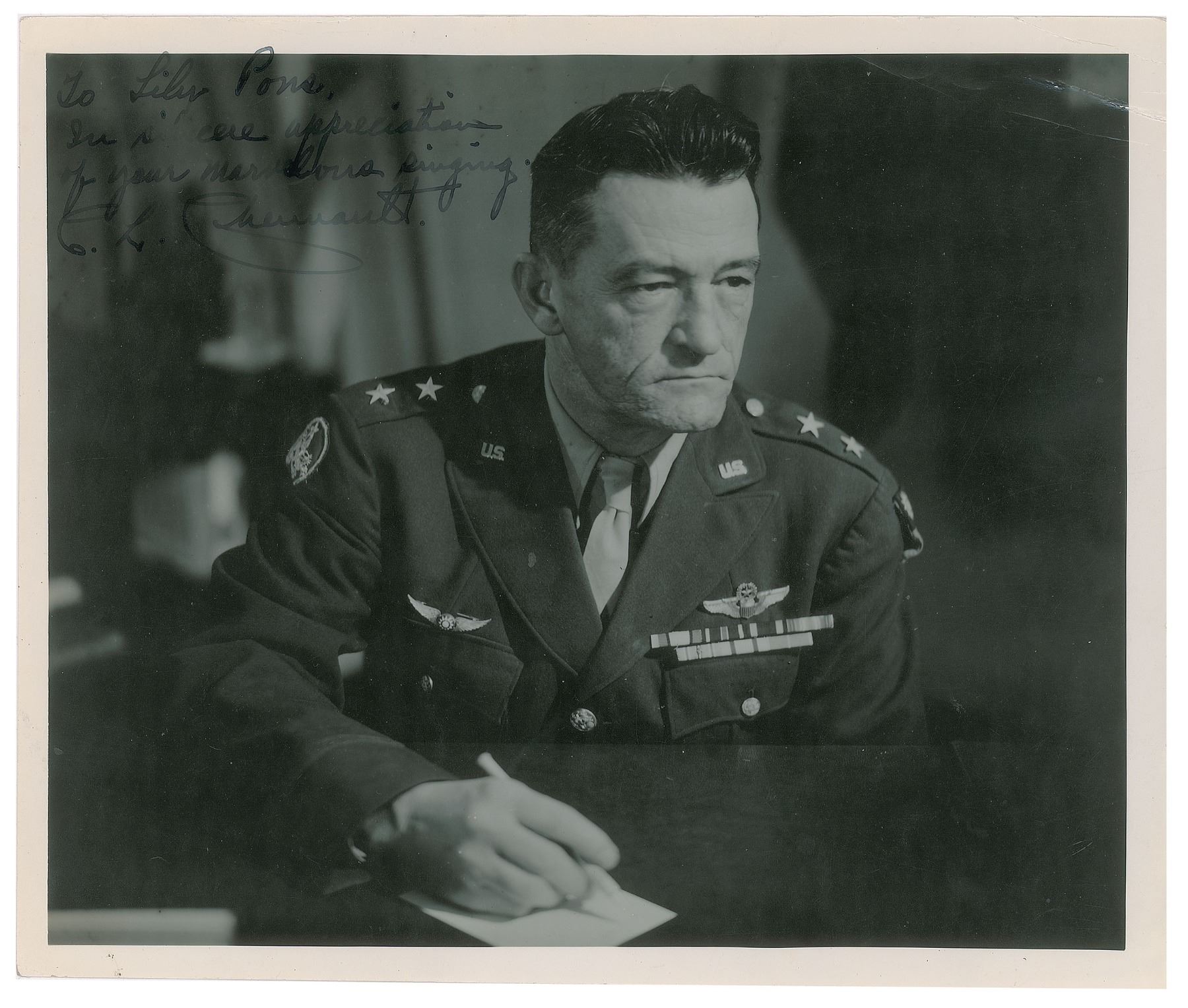 Vintage semi-glossy 9 x 7.5 photo of Major General Chennault at his desk, signed and inscribed in fountain pen, "To Lily Pons, in sincere appreciation of your marvelous singing, C. L. Chennault.” Reverse bears an "Official Photo, 16th AAF Combat Camera Unit" stamp. In very good to fine condition, with trimmed edges, and scattered light creasing, heavier to the upper right corner.