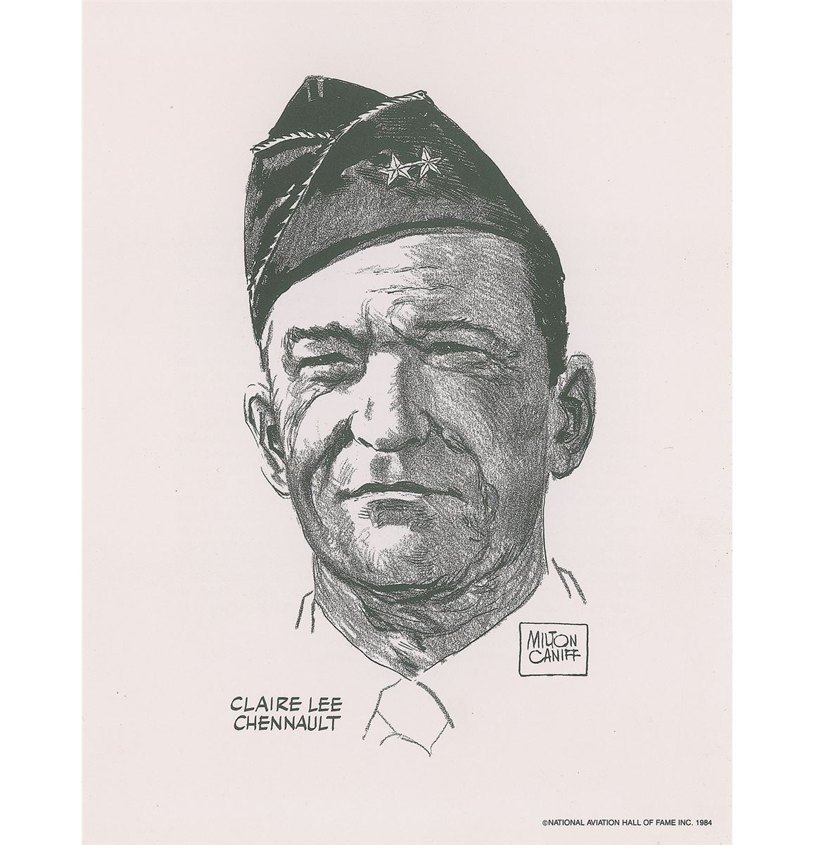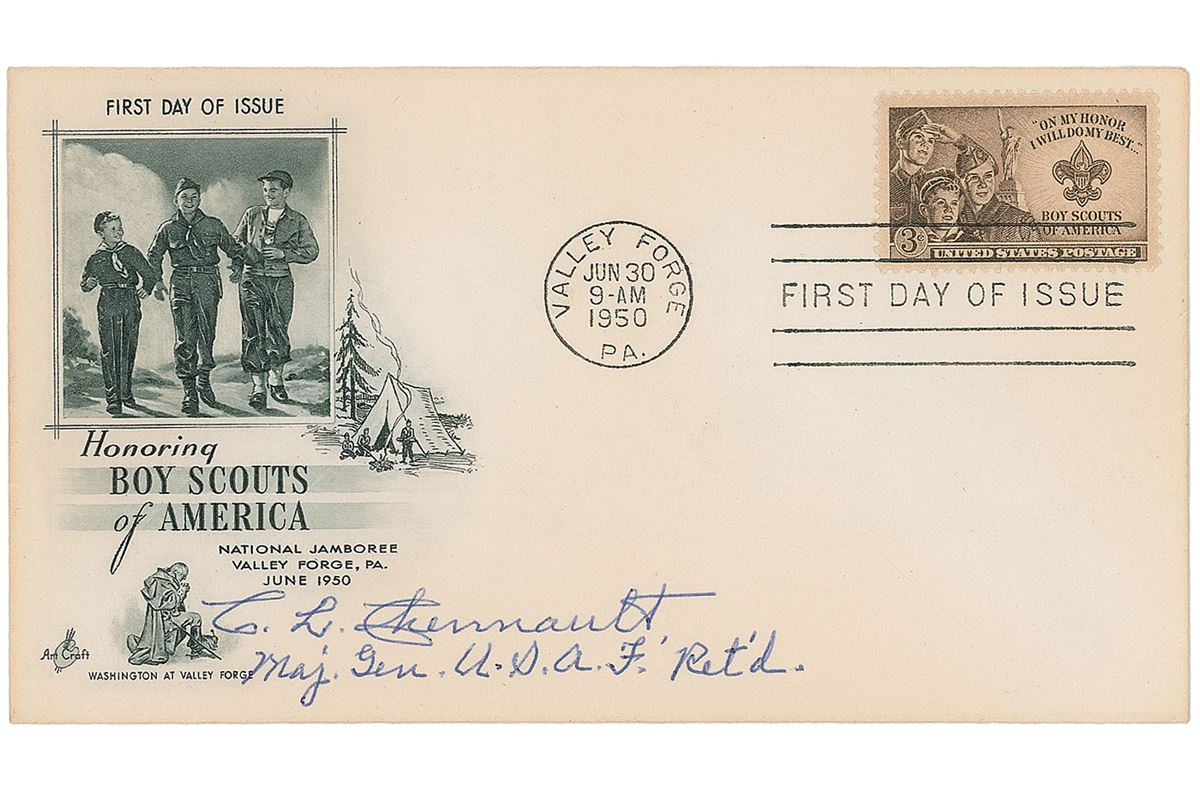 Air Force general (1893–1958) who commanded the famous Flying Tigers during World War II. FDC with a cachet honoring the 1950 Boy Scouts of America national jamboree, signed in blue ballpoint, “C. L. Chennault, Maj. Gen. U.S.A.F.’ Ret’d.” In fine condition. Accompanied by an unsigned printed sketch of Chennault by artist Milton Caniff.
