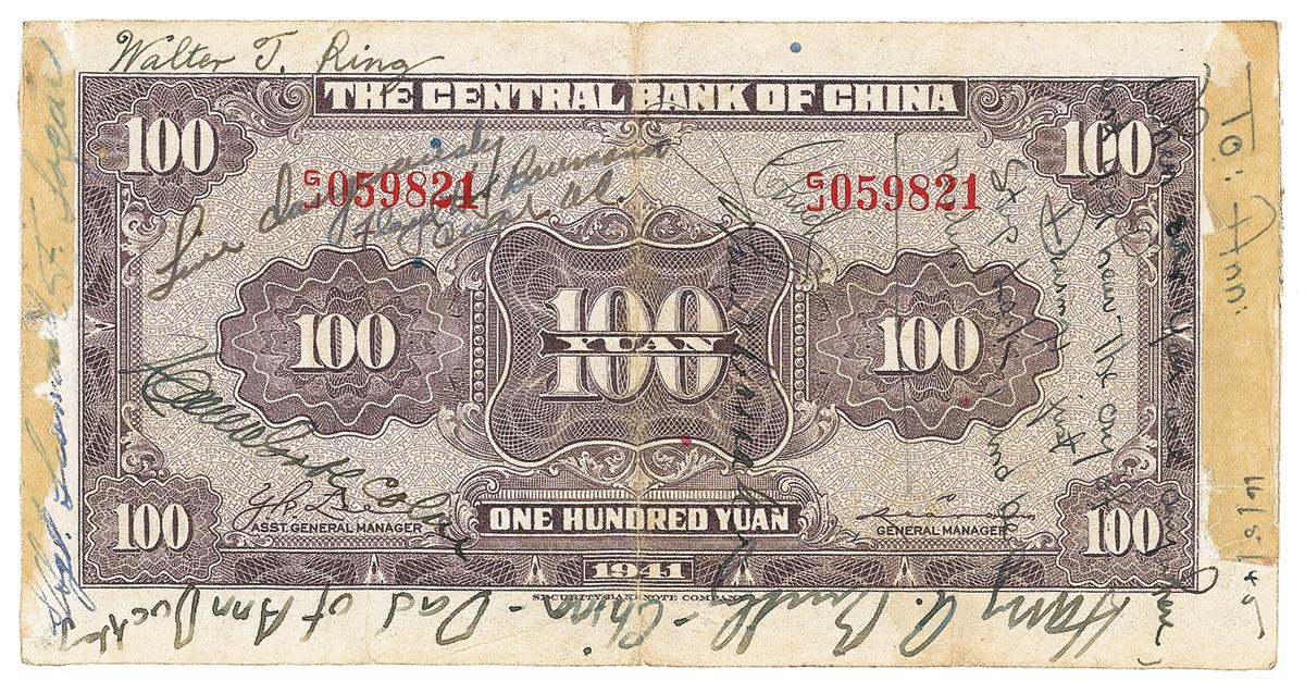 Bank of China 100 Yuan note, 1941 issue, signed vertically on the portrait side, “C. L. Chenault.” Also signed on the portrait side by three others, as well as multiple signatures on reverse. Light contrast to beginning initials of signature, several vertical creases, and old tape remnants to vertical edges, otherwise fine condition. RRAuction COA.