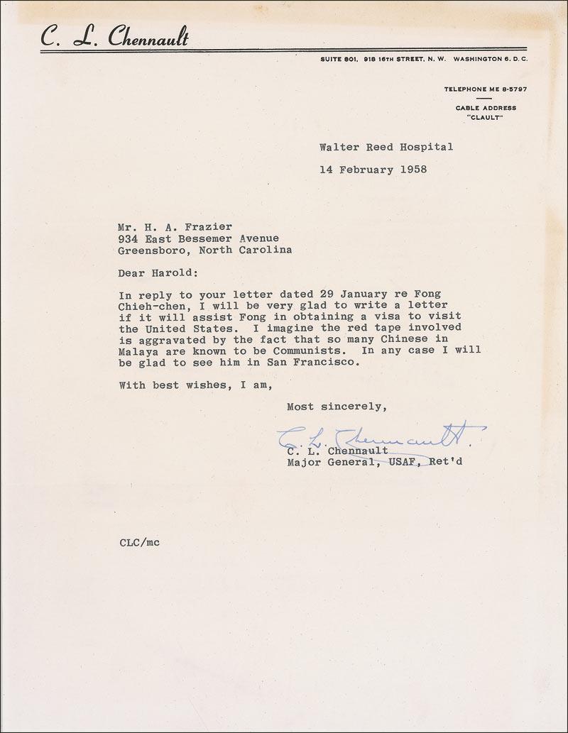 TLS signed “C. L. Chennault,” one page, 8.5 x 11, personal letterhead, February 14, 1958. Chennault offers assistance to a friend. In part: “I will be very glad to write a letter if it will assist Fong in obtaining a visa to visit the United States. I imagine the red tape involved is aggravated by the fact that so many Chinese in Malaya are known to be Communists. In any case I will be glad to see him in San Francisco.” In fine condition, with toning to top and right edge. Pre-certified PSA/DNA and RRAuction COA.