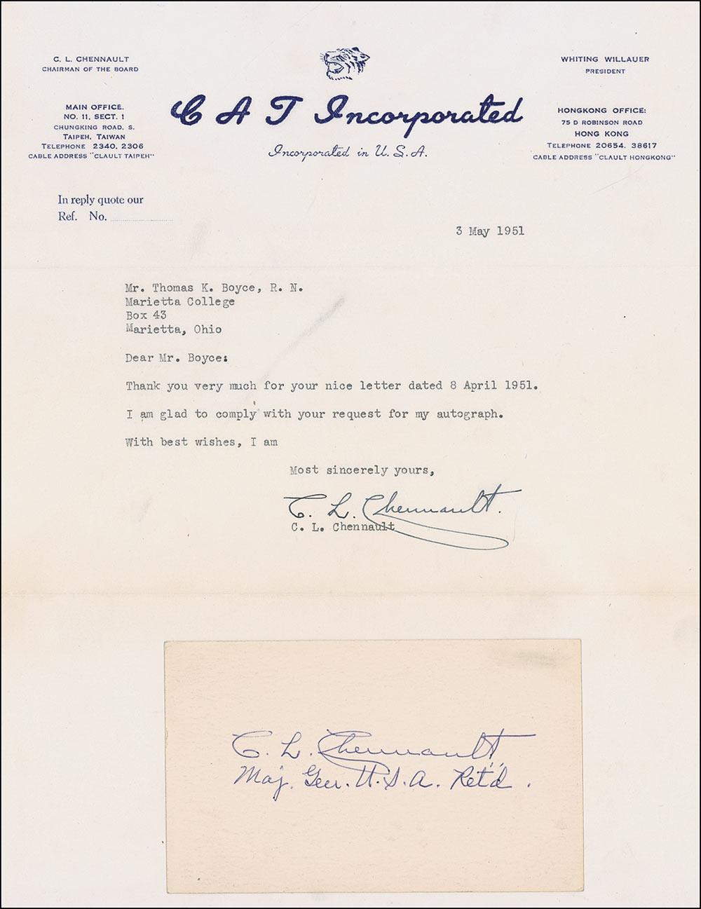 Air Force general (1893–1958) who commanded the famous Flying Tigers during World War II. Two items: TLS signed “C. L. Chennault,” one page, 8.5 x 11, CAT letterhead, May 3, 1951. Chennault responds to a collector’s request. In part: “Thank you very much for your nice letter dated 8 April 1951. I am glad to comply with your request for my autograph”; and a blue fountain pen signature, “C. L. Chennault, Maj. Gen. U.S.A. Ret’d.”, on a 5 x 3 card. In fine condition, with scattered light soiling to the card. Pre-certified PSA/DNA and RRAuction COA.