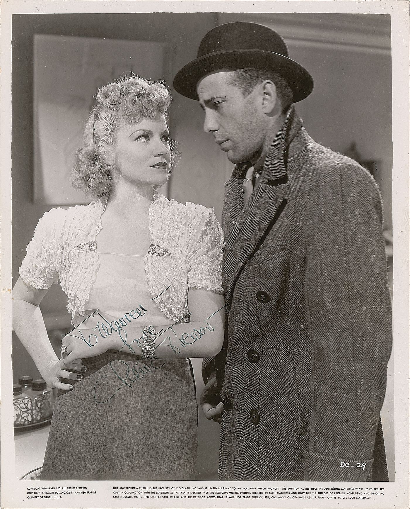 American actress (1910–2000) who won the Academy Award for Best Supporting Actress for her role in Key Largo, and earning nominations for her roles in The High and the Mighty and Dead End. Vintage glossy 8 x 10 Vitagraph publicity photo of Trevor as Jo Keller, standing next to Humphrey Bogart in the 1938 film The Amazing Dr. Clitterhouse, signed and inscribed in fountain pen, "To Warren—Love, Claire Trevor.” In fine condition.