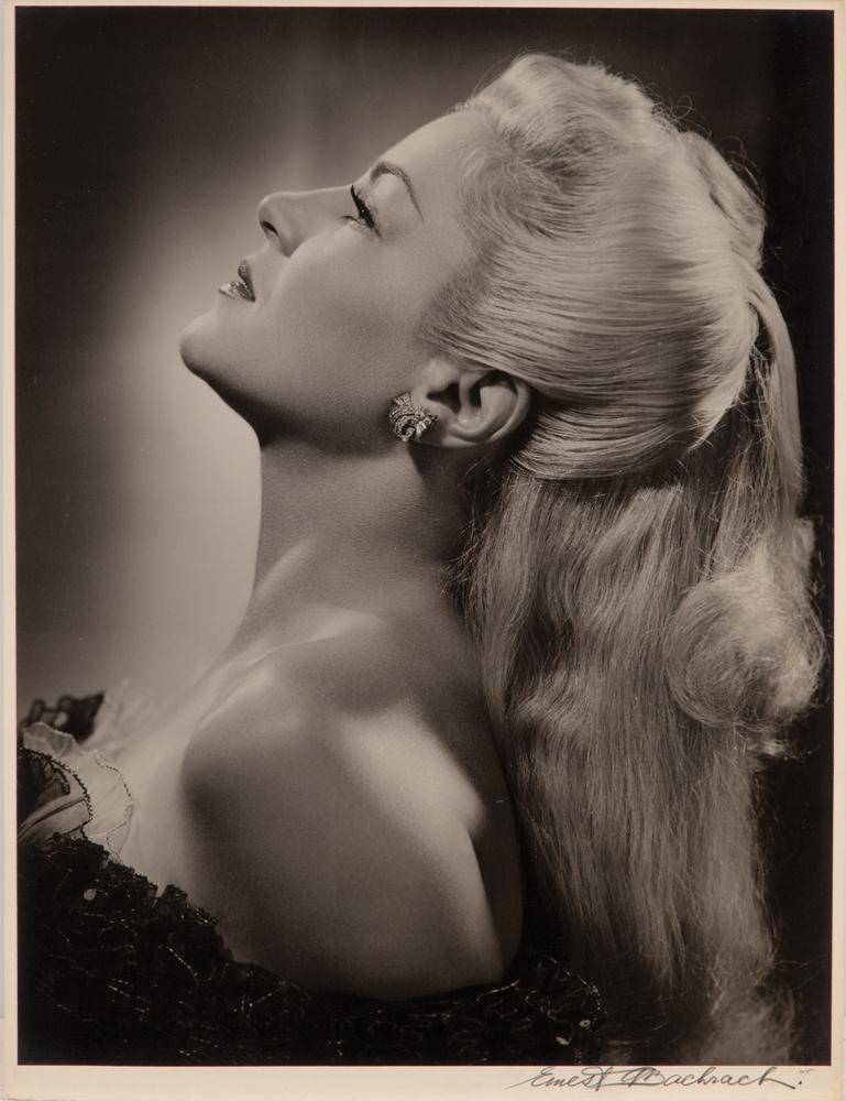 (RKO, 1945) Silver bromide matte borderless 14- ½ x 19- ¼ in. (on 15 x 20 in. 8-ply board mount) exhibition print of Claire Trevor from Johnny Angel by Ernest A. Bachrach; with photographer signature Ernest A. Bachrach `45 in pencil on the mount recto. From the personal collection of the photographer. Very fine; with light silvering at the edges.