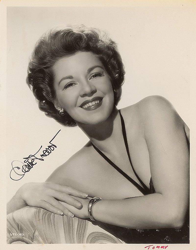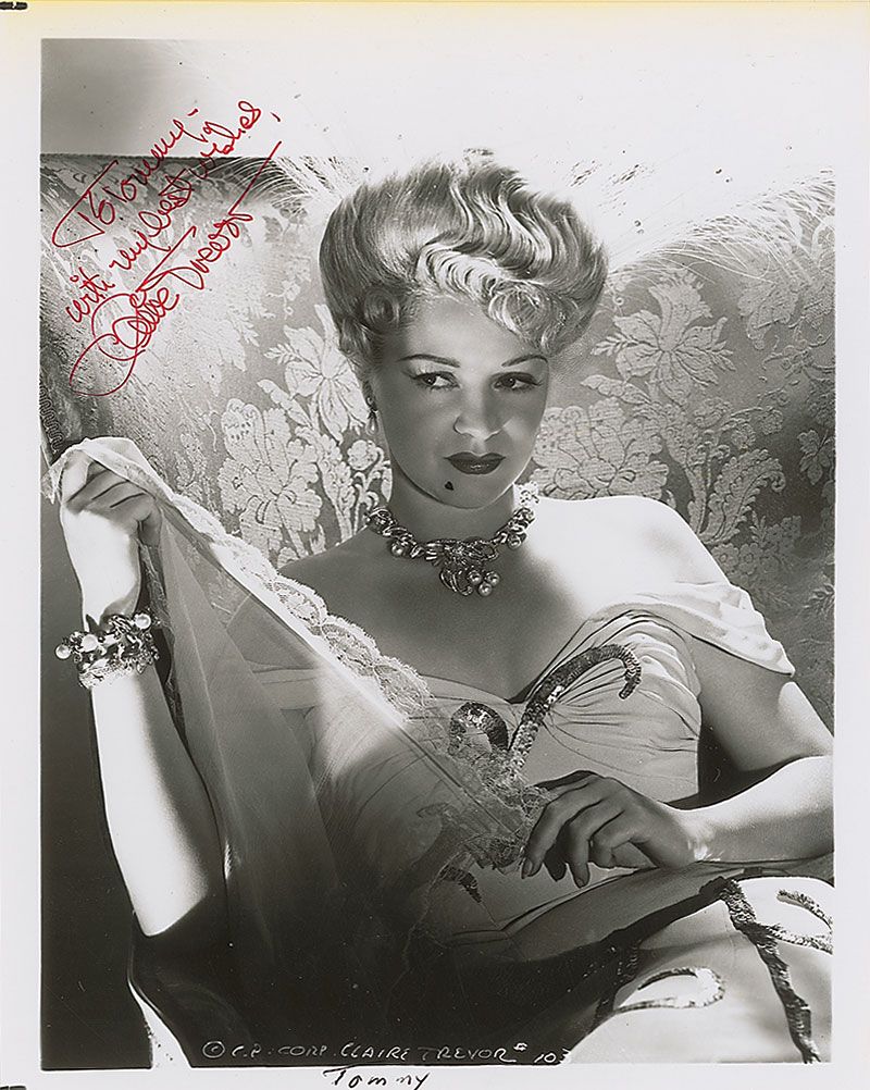 Two glossy 8 x 10 photos of Trevor, one signed in black felt tip and one signed and inscribed in red felt tip, “To Tommy—with my best wishes, Claire Trevor.” Light scattered creases, notations to lower border, and toning to top, otherwise fine condition.