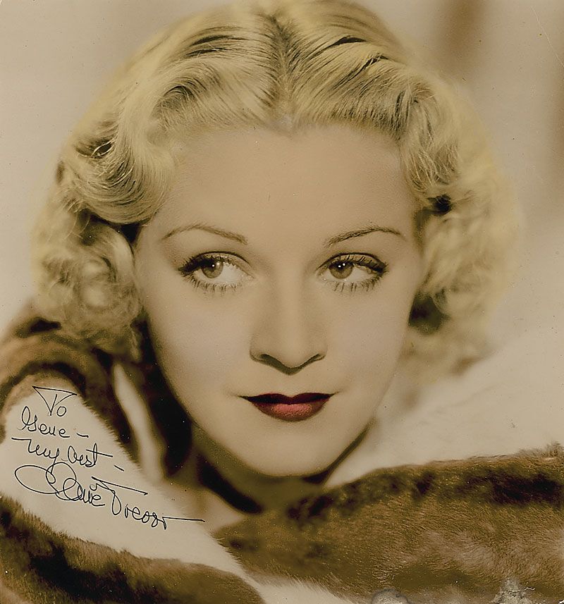 Beautiful original color glossy 9.75 x 10.5 photo of Trevor, signed and inscribed in black ink, “To Gene—My best—Claire Trevor.” In fine condition, with some dampstaining to the lower right corner (not affecting the terrific overall appearance of the image), and likely trimmed edges.