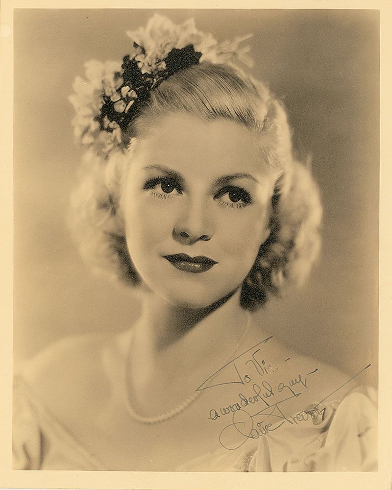 Beautiful vintage matte-finish 8 x 10 portrait, signed and inscribed in fountain pen, “To Vic—a wonderful guy—Claire Trevor.” In fine condition, with some irregular adhesion to the end of the inscription and a speck of surface loss to the upper left border (not affecting the image). Originates from the personal collection of Victor Johnson, who worked as a gaffer at Warner Bros. for over forty years.