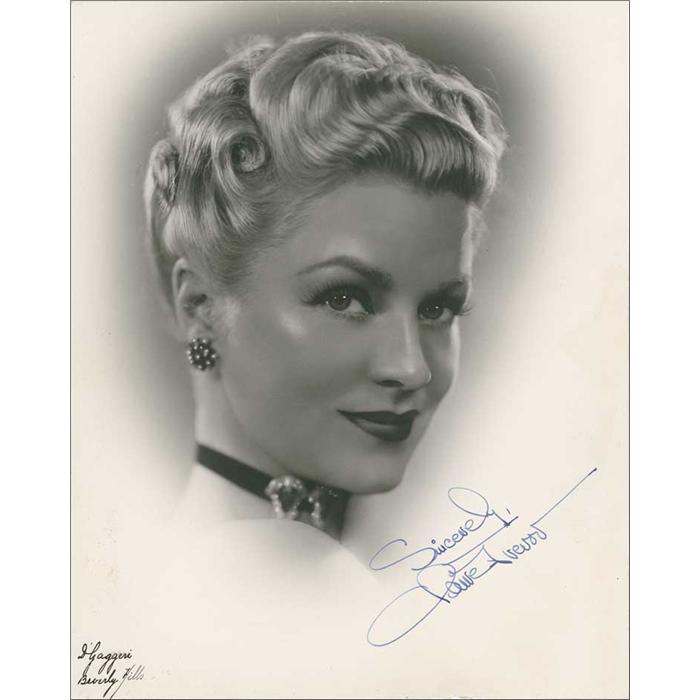 Stunning vintage matte-finish 7.75 x 9.75 photo by D’Gaggeri of Beverly Hills, signed in blue ink, “Sincerely, Claire Trevor.” In fine condition, with lightly trimmed edge, and a couple dings to bottom edge. Pre-certified PSA/DNA and RRAuction COA.
