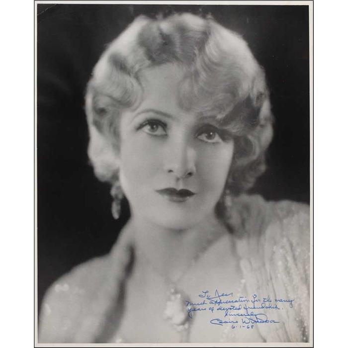 Notable American film actress of the early silent screen era. Oversized 16 x 20 matte-finish photo, signed in blue felt-tip. Inscribed to “To Jess, Much appreciation for the many years of devoted friendship, Sincerely, Claire Windsor 6-1-68.” In fine condition, with a few small corner creases. Pre-certified PSA/DNA and RRAuction COA.