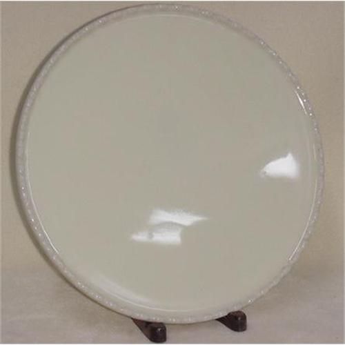 14 1/4" round flat plate with raised border rim, a good cake plate. Originally used in a dental office as the part of the dentist chair that held the dental tools while the dentist was working on the patient. Clam broth in color with a slight hint of iridescences. Signed Ritter Company, Inc. Rochester NY, made in the United States of America.