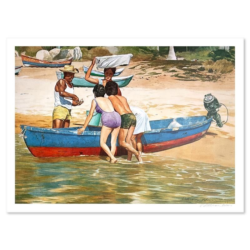 "Clam Fisherman" is a limited edition lithograph on paper, numbered and hand signed by William Nelson. Includes Letter of Authenticity. Measures approx. 28.5" x 22" (border), 25" x 18" (image). ** Please note: there are noticeable imperfections in the border area (creases and smudges) and minor scuffs on the image. **