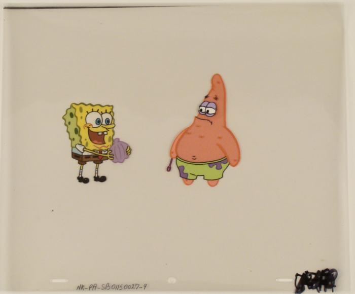 To create production cels, the original animator's drawing is transferred onto an acetate cel (by hand-inking and/or photo copying). The cel is then hand-painted on the reverse side. The cel is ready to be matted and framed. The animator's notations are at the bottom of the cel. There is some paper residue on the back of the cels. The cel has multiple layers; first is Patrick's eyes, the second cel is Patrick's outline, the third cel is Patrick's body, and finally the last cel is SpongeBob.