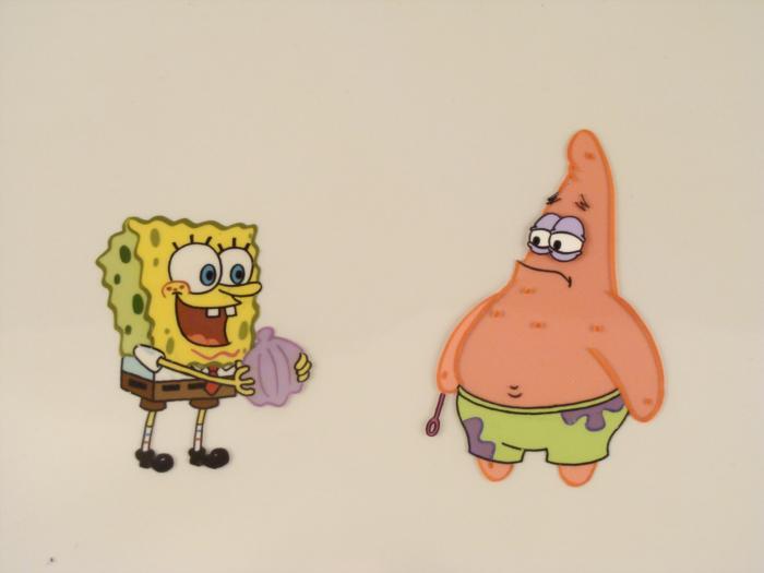 This original animation cel is from the Nickelodeon TV show SpongeBob Squarepants. The story takes place under the deep blue sea in Bikini Bottom, where SpongeBob resides. SpongeBob, who is a yellow, porous sponge, is your typical happy-go-lucky character, as he is always cheerful and enjoys making people laugh. Patrick Star, SpongeBob's neighbor who is a starfish, is your average children's show idiot, as he boasts knowing nothing and is often getting himself into ridiculous situations. Between the homes of these two lies the home of the miserable Squidward, a squid, who is known for being grouchy and playing tricks on SpongeBob and Patrick. Both SpongeBob and Squidward work at the Krusty Krab, a fast food business run by the greedy money-loving Mr. Krabs, a crab, the arch rival of the evil, possibly misunderstood, Plankton. Another neighbor, Sandy Cheeks, an athletic squirrel who normally wears an astronaut's space suit, was introduced in "Tea at the Treedome." She spends most of her time inventing and experimenting. Why is SpongeBob holding a clam.Original Production Animated Cel Overall Size of Cel: 10 1/2" x 12 1/2" Very Good ConditionThis is an original hand-painted cel set-up used in the production of an episode of "SpongeBob SquarePants." Each one-of-a-kind set-up represents a slight change in position of the characters. When individually photographed and projected in rapid succession, the images appear to move.