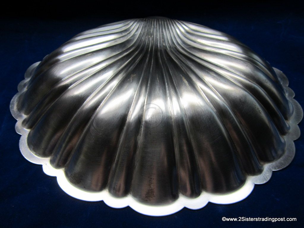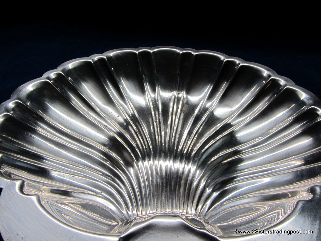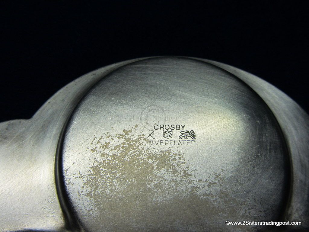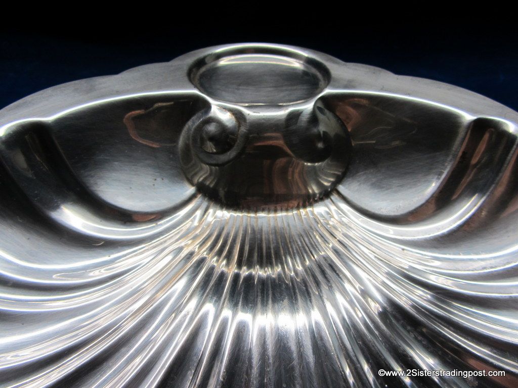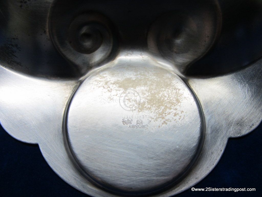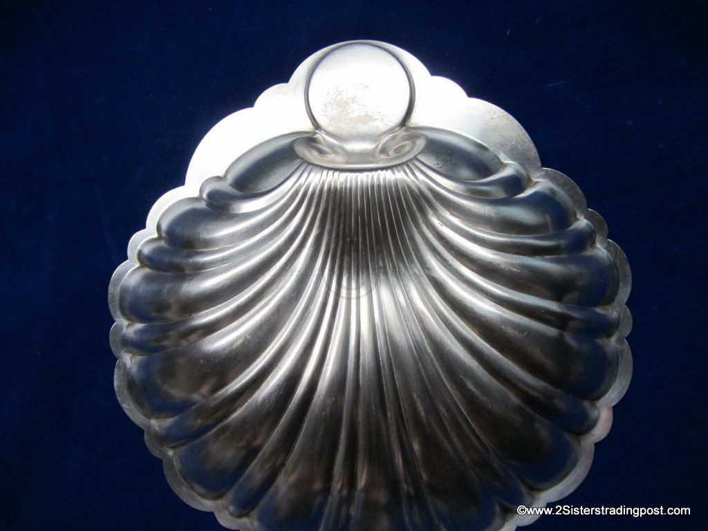 Crosby silver-plated dip ripple design clam shell serving tray. This dish is in very good overall used condition. Approx. 1 1/2" deep x 10 1/2" across the clam shell x 11" from top to bottom. NOTE: some slight pitting and faint cleaning and storage scratches front and back. (please see images for all details)