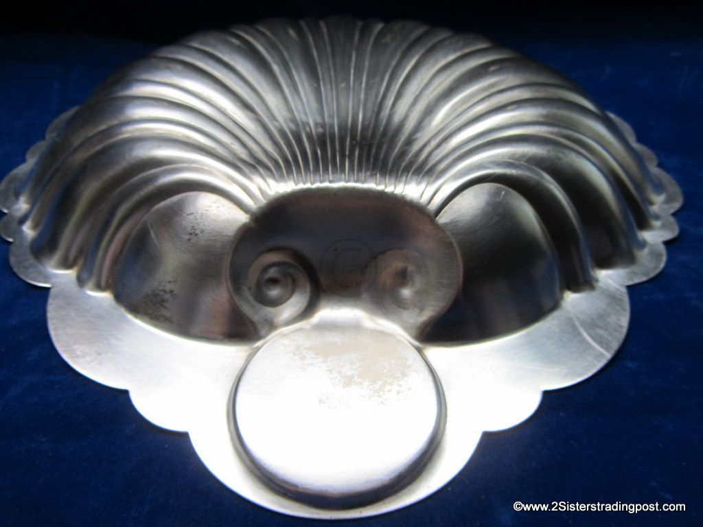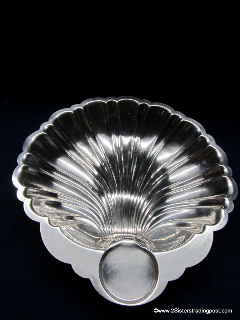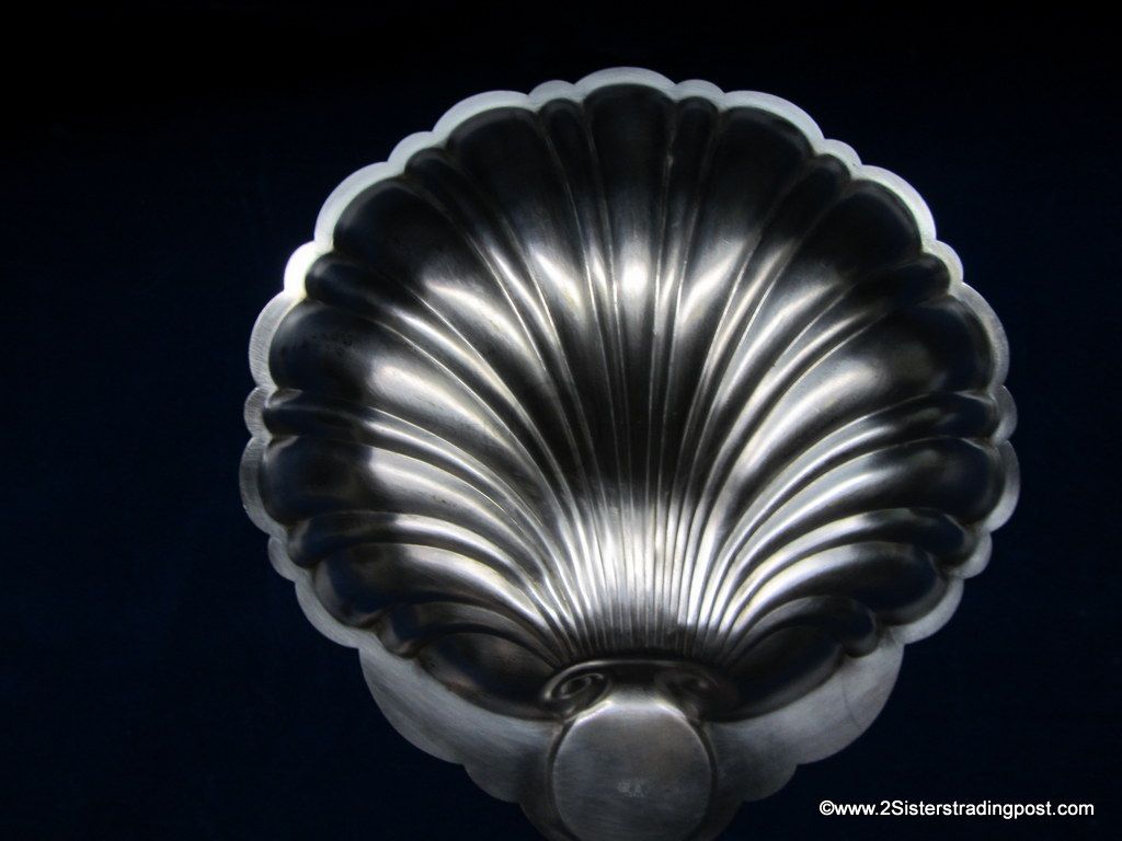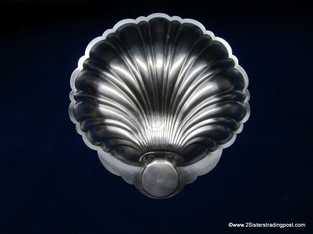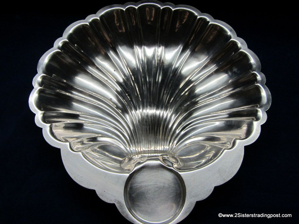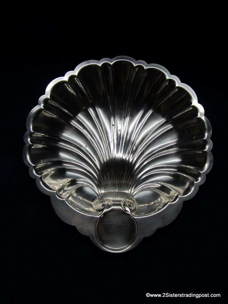 Crosby silver-plated dip ripple design clam shell serving tray. This dish is in very good overall used condition. Approx. 1 1/2" deep x 10 1/2" across the clam shell x 11" from top to bottom. NOTE: some slight pitting and faint cleaning and storage scratches front and back. (please see images for all details)