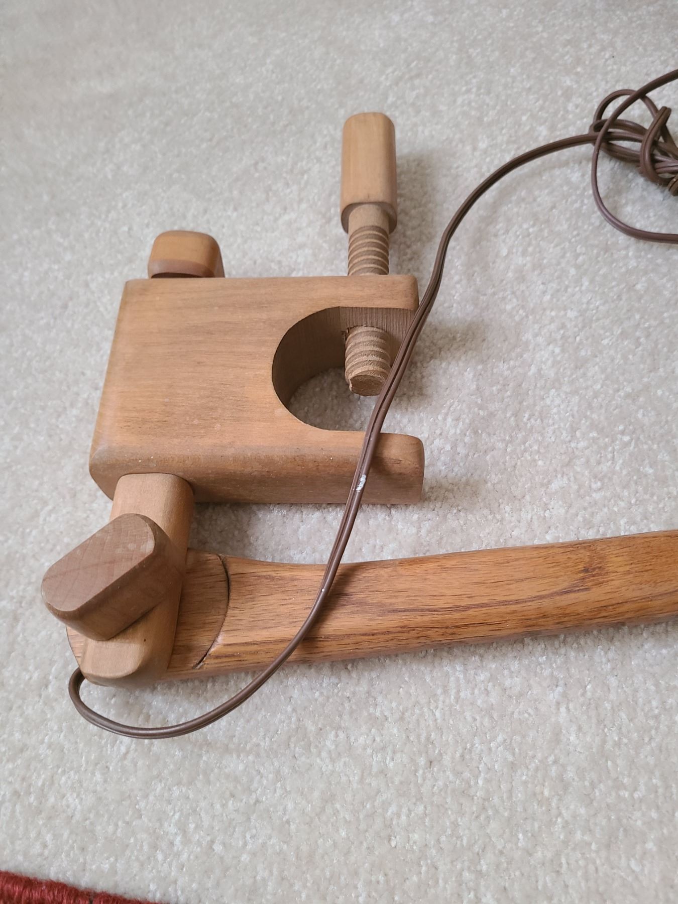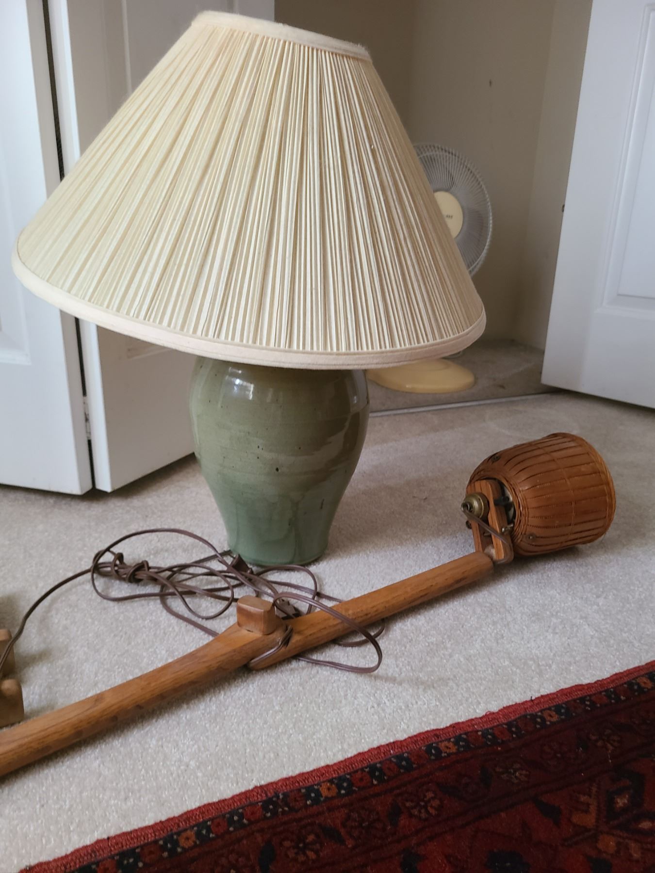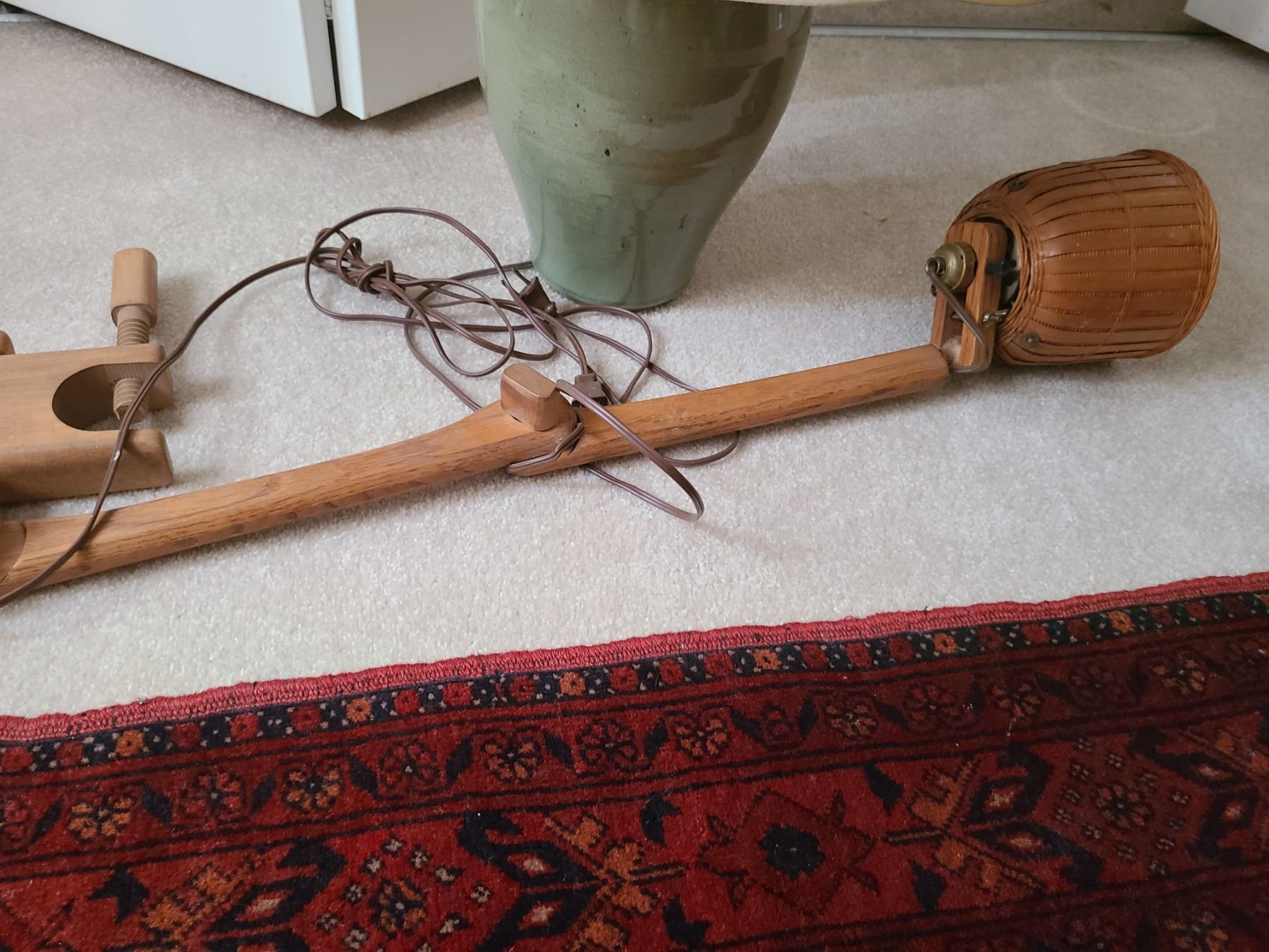 Wooden clamp style table lamp and table lamp included. Pickup at 9 am.