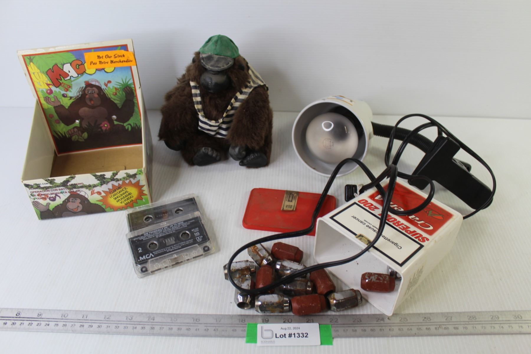 Clamp-on Lamp (working) - Battery Operated Gorilla - Lug Nuts - (2) Cassette Tapes Chris Kross - Tragically Hip