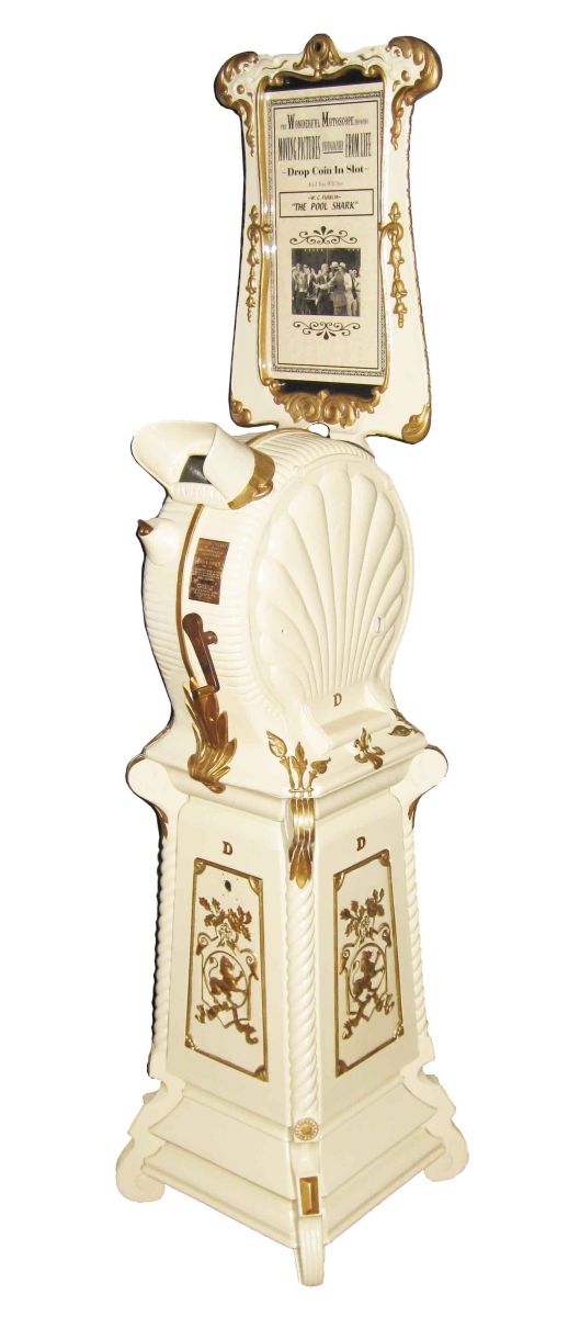 Clamshell Mutoscope, Coin operated, cast iron made by the American Mutoscope & Biograph Co. NY. Excellent Restored working condition. A real beauty. Comes with key. 16 X 64 X 16 inches.