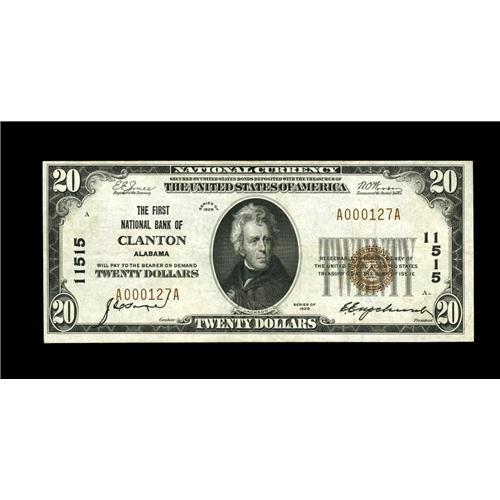 <B>Clanton, AL</B></I> - $20 1929 Ty. 1 <B>The First NB </B></I> Ch. # 11515<BR>This Chilton County hamlet had but one issuing bank and notes from here are an exceptional challenge to locate in any grade, let alone with the cleanly original eye appeal of this nice example. <B>Extremely Fine,</B></I> certainly the most attractive specimen we have ever encountered from this institution and by far the nicest example, large or small, recorded from here in the Kelly census.