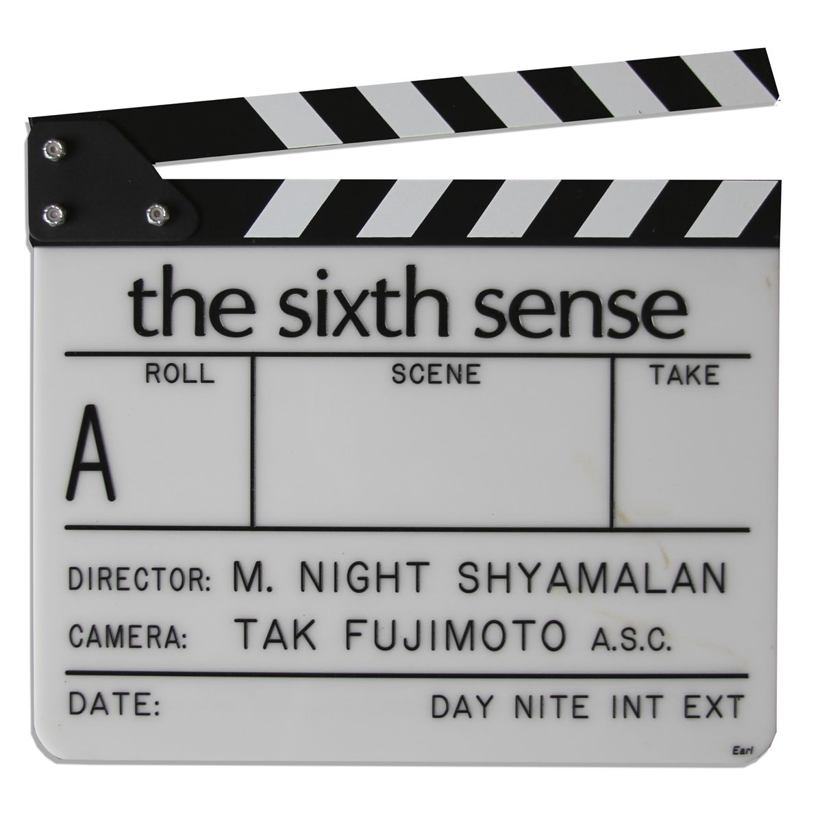 Clapboard from the groundbreaking supernatural drama, ''The Sixth Sense'' starring Bruce Willis and Haley Joel Osment, whose character famously ''sees dead people''. Slate, used to sync the sound recording with the picture in editing, has imprinted lettering in black, listing the film's title and names of the writer-director M. Night Shyamalan and his director of photography Tak Fujimoto. Made chiefly of white acrylic, with the classic black and white chevron clapstick made of wood. Clapstick opens on a hinge at the left and has a magnetized element at its other end. Measures 11'' x 9.75''. Near fine.