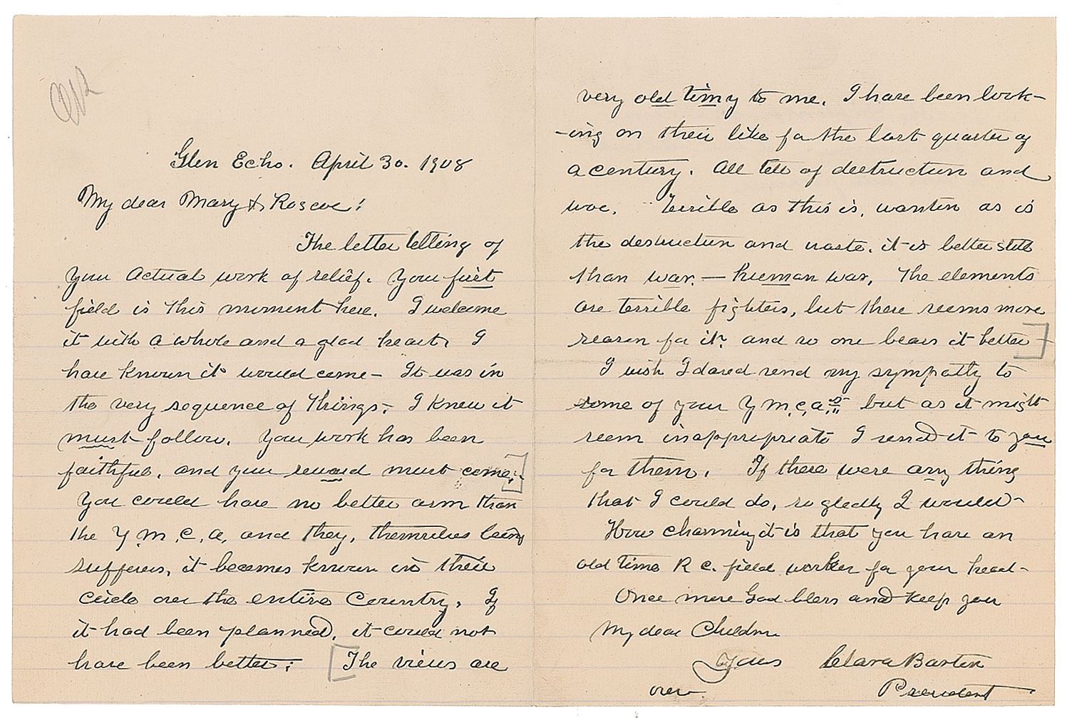 ALS signed “Clara Barton, President,” two pages on two adjoining sheets, 5.25 x 7, April 30, 1908. Letter to Mary and Roscoe, in part: "The letter telling of your actual work of relief. Your first field is this moment here. I welcome it with a whole and a glad heart. I have known it would come—It was in the very sequence of things. I knew it must follow. Your work has been faithful, and your reward must come. You could have no better arm than the Y.M.C.A. and they, themselves being sufferers, it becomes known in their circle over the entire country. If it had been planned, it could not have been better: The views are very old timey to me. I have been looking on their like for the last quarter of a century. All tell of destruction and woe. Terrible as this is, wanton as is the destruction and waste, it is better still than war—human war. The elements are terrible fighters, but there seems more reason for it, and no one bears it better." In fine condition.
