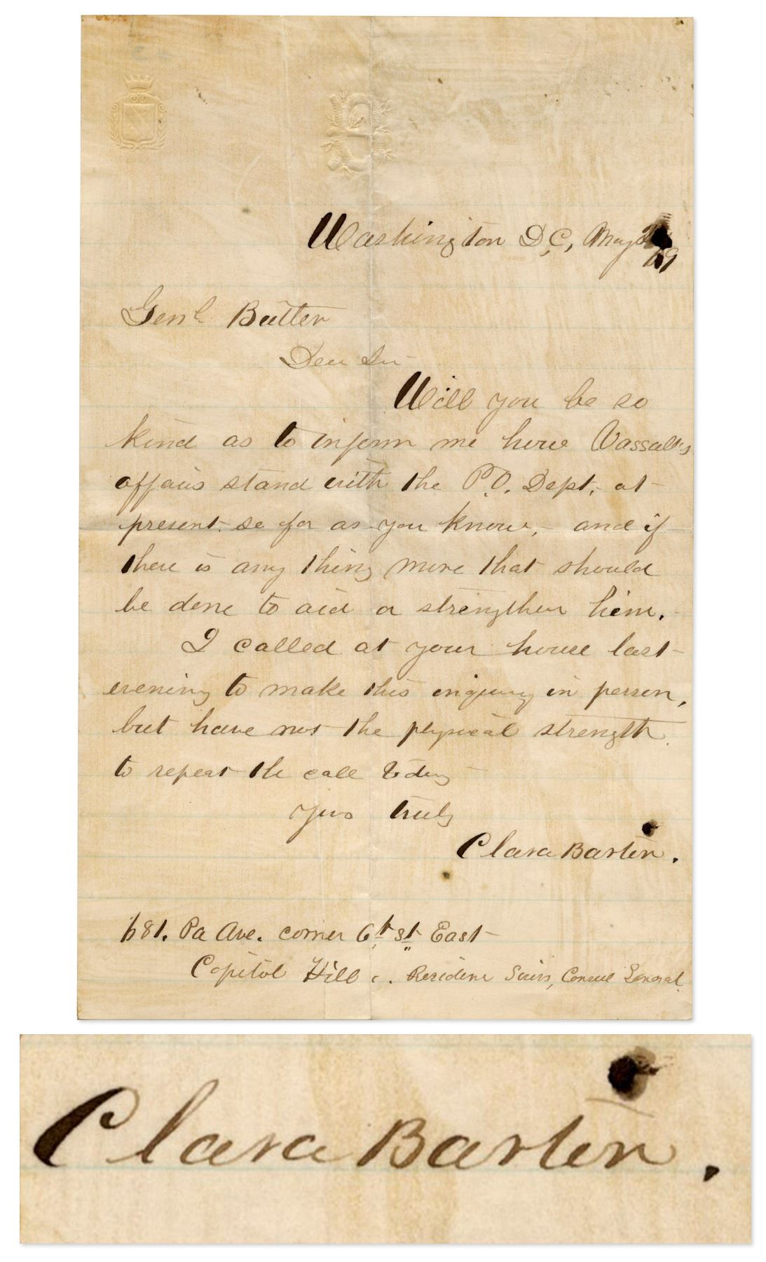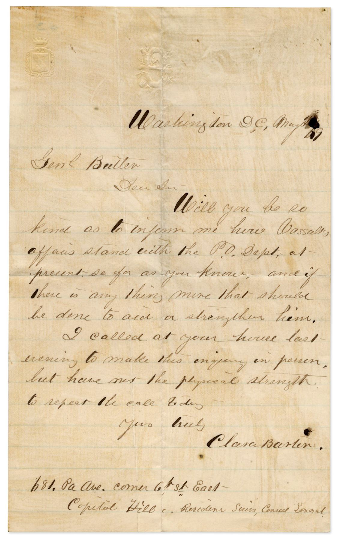Clara Barton autograph letter signed to her closest political ally, General Benjamin Butler. Written from Washington, DC on 29 May (no year), Barton inquires about the status of a family member: ''Genl Butler / Dear Sir / Will you be so kind as to inform me how Vassall's affairs stand with the P.O. Dept. at present, so far as you know, and if there is anything more that should be done to aid or strengthen him. / I called at your house last evening to make this inquiry in person, but have not the physical strength to repeat the call today - Yrs truly / Clara Barton''. Clara's sister, Sally Barton, married Vester Vassall, so this letter is likely in reference to either him, or one of their two children. Single page letter measures 5'' x 8''. Mounted to cardstock, otherwise very good condition.