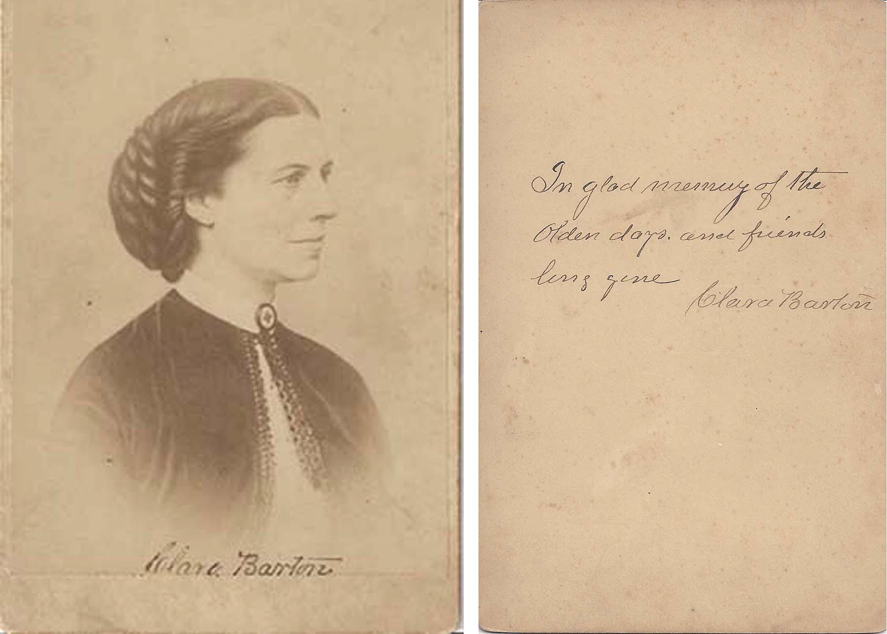 Scarce cabinet portrait, neatly signed ''Clara Barton'' along the bottom of the image in black fountain pen. On the verso, the Red Cross founder has additionally penned, ''In glad memory of the / olden days and friends / long gone / Clara Barton.'' Very good condition, with subtle soiling and foxing to the image and mount.