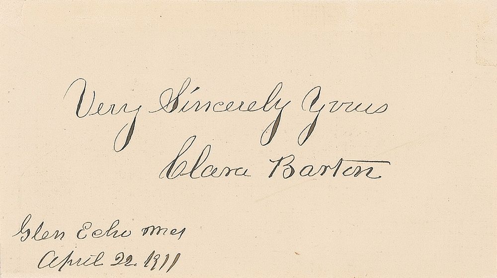 Teacher and humanitarian (1821–1912) best known for organizing the relief organization the American Red Cross. Vintage fountain pen signature, “Very sincerely yours, Clara Barton, Glen Echo Md. April 22, 1911,” on an off-white 4.5 x 2.5 card. In fine condition, with lightly trimmed edges.