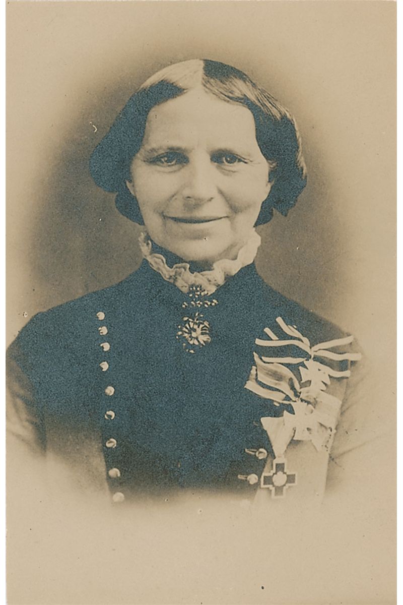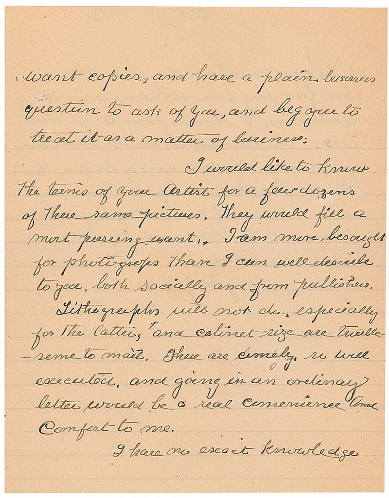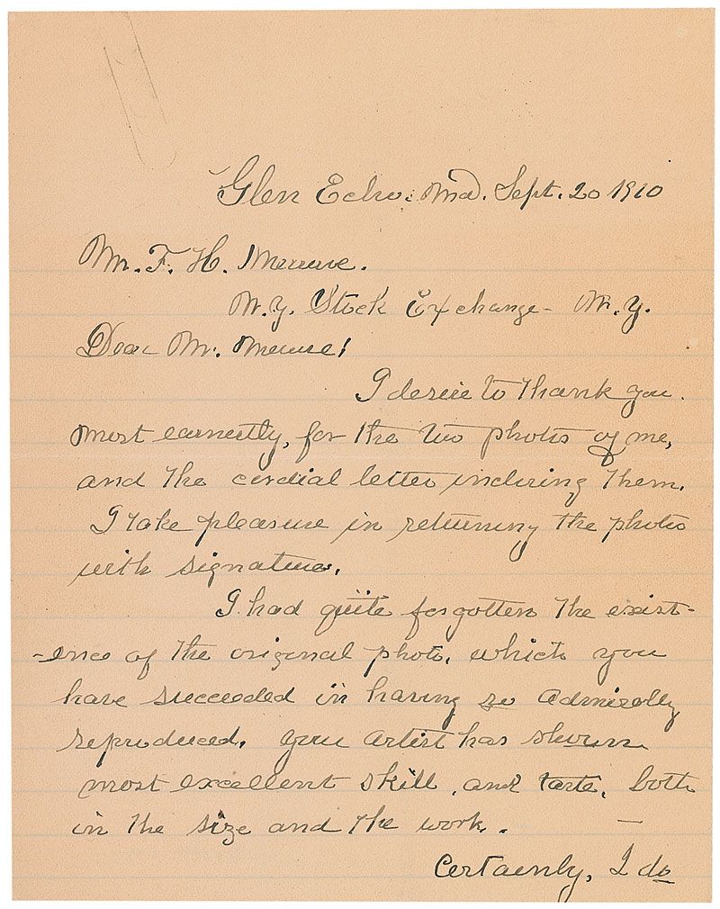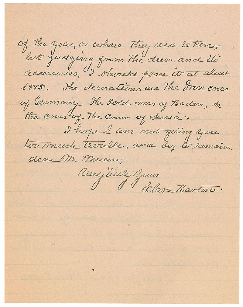 ALS, three pages, lightly-lined on two adjoining sheets, 5.25 x 6.75, Glen Echo, September 20, 1910. Letter to F. H. Meserve of New York. In part: “I had quite forgotten the existence of the original photo. which you have succeeded in having so admirably reproduced, your artist has shown most excellent skill…I have no exact knowledge of the year, or where they were taken, but judging from the dress and its accessories, I should place it at about 1885. The decorations are The Iron Cross of Germany, The Gold Cross of Baden, & the Cross of The Crown of Serria.” In fine condition, with a paperclip mark to the first page. Accompanied by the original mailing envelope and an unsigned 2 x 3.25 period portrait of Barton adorned in medals, presumably that referred to in the letter.