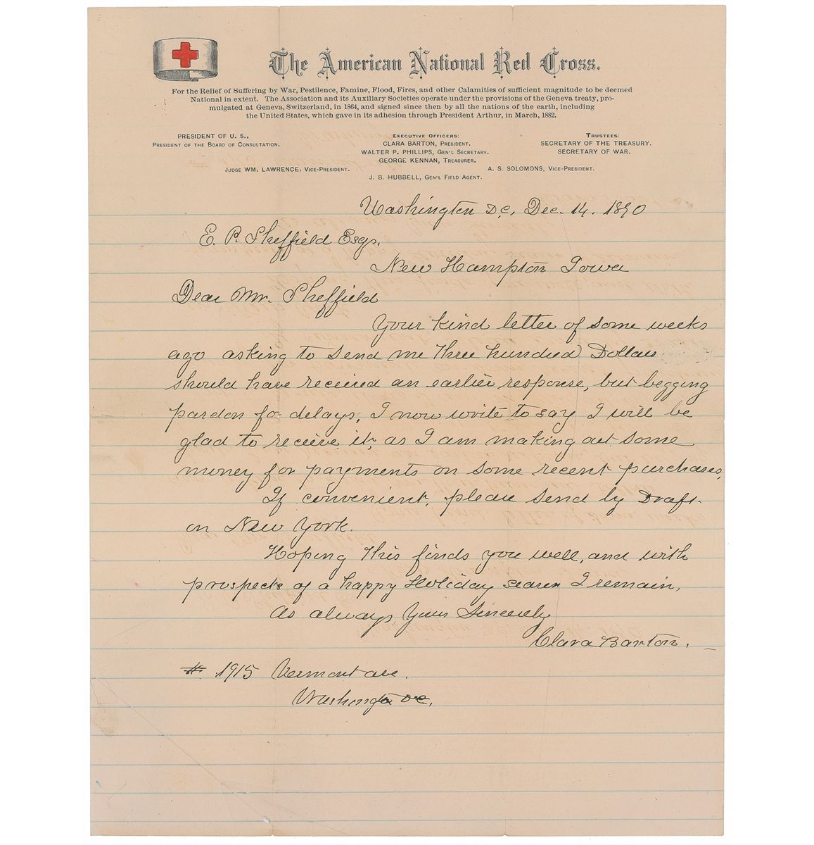 ALS, one page, 8.5 x 11, American National Red Cross letterhead, December 14, 1890. Letter to E. P. Sheffield. In part: “Your kind letter of some weeks ago asking to send me Three hundred dollars should have received an earlier response, but begging pardon for delays, I now write to say I will be glad to receive it, as I am making out some money for payments on some recent purchases.” Intersecting folds, creases to lower left, and a uniform shade of mild toning, otherwise fine condition.