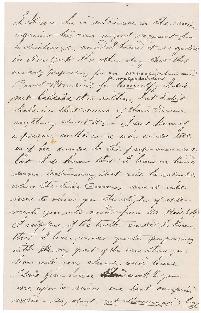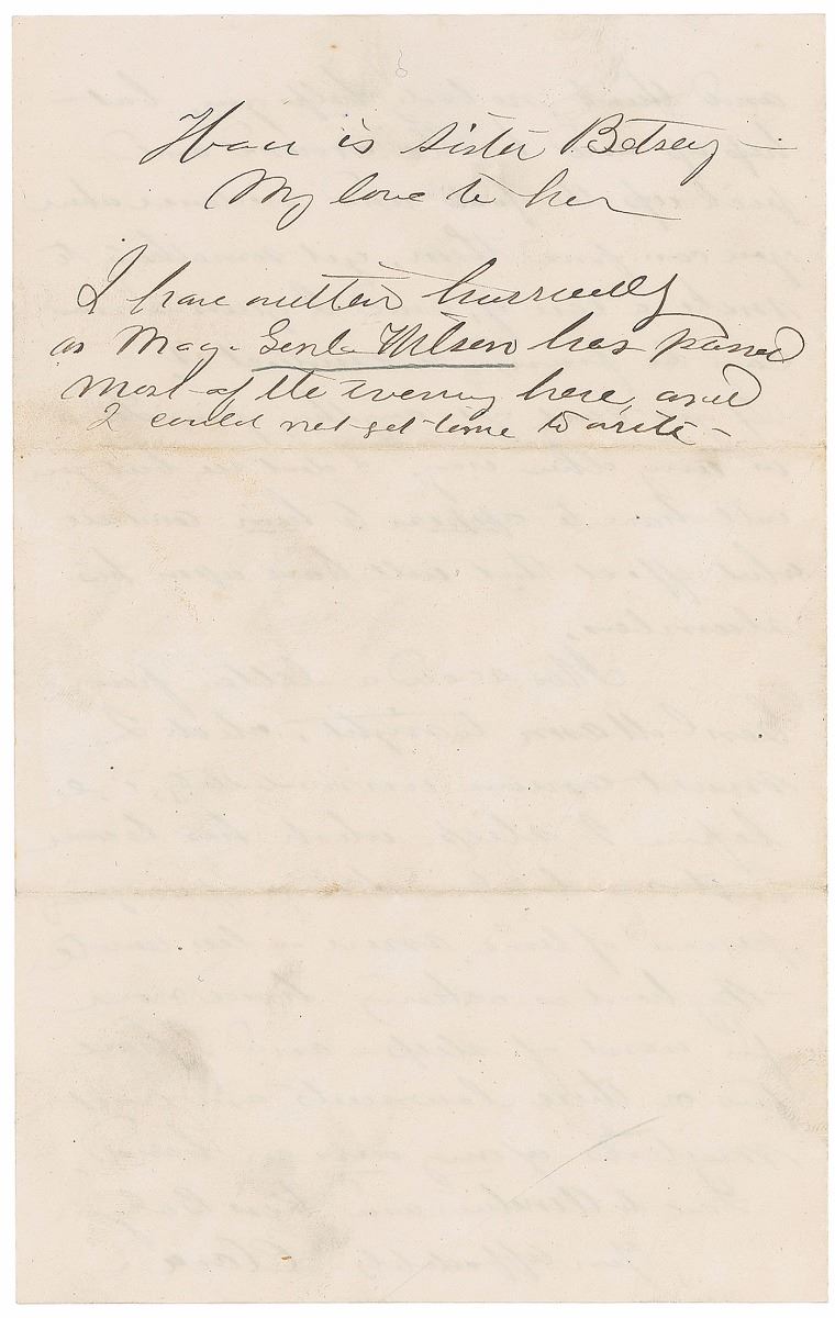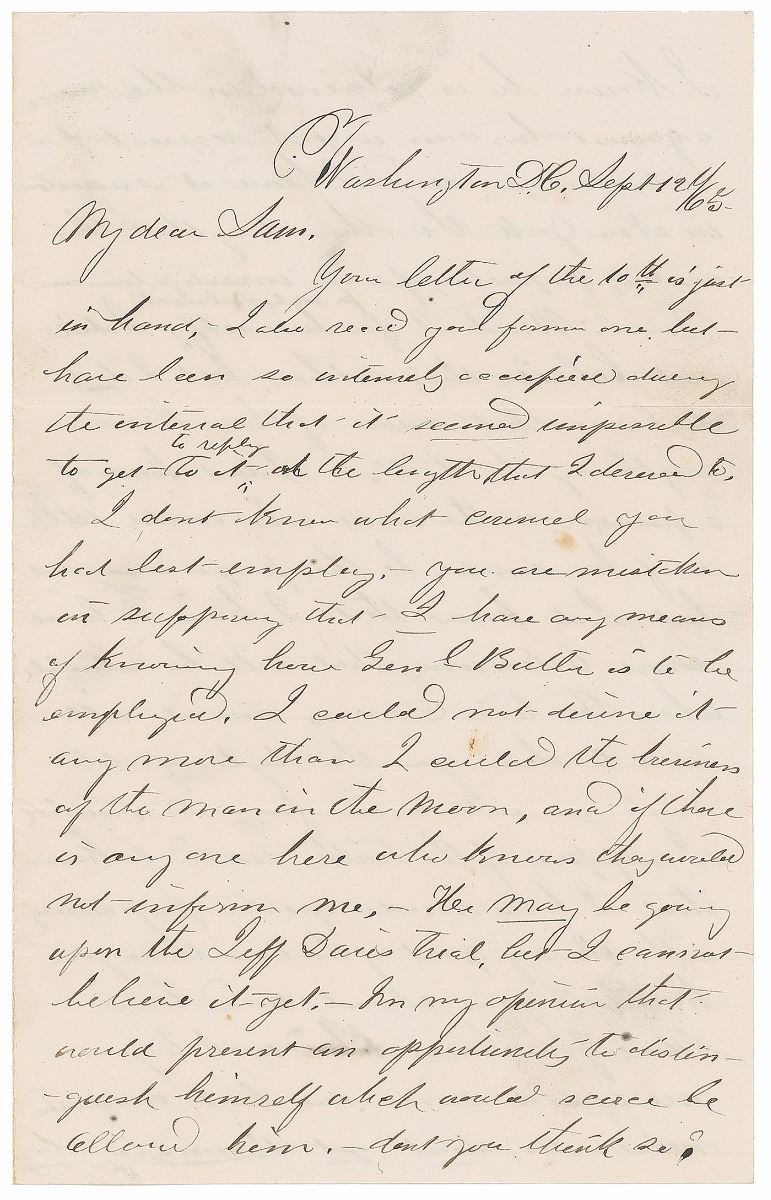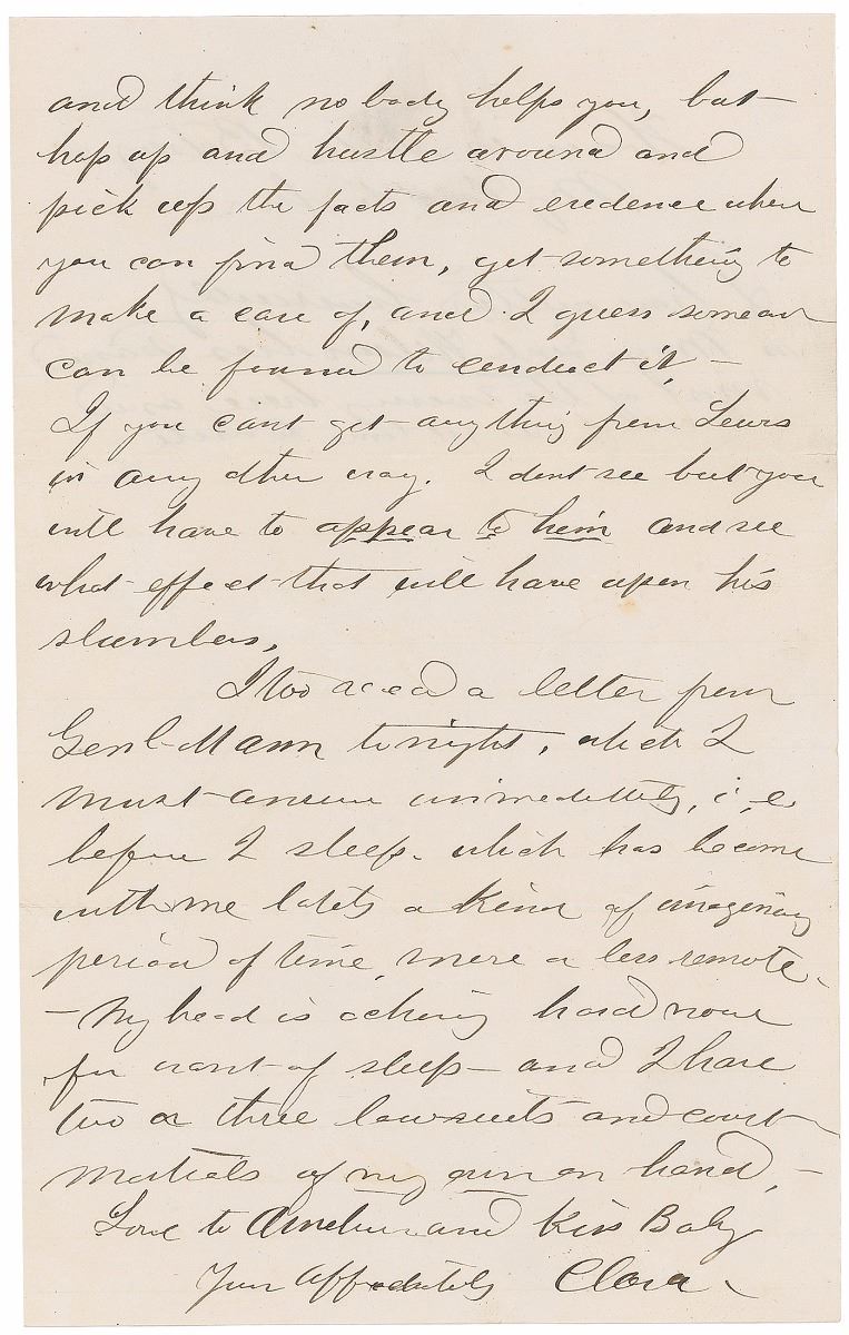 ALS signed “Clara,” four pages on two adjoining sheets, 5 x 8, September 12, 1865. Letter to her nephew Sam, in part: “I don’t know what counsel you had best employ. You are mistaken in supposing that I have any means of knowing how Genl Butler is to be employed. I could not devise it any more than I could the business of the man in the moon, and if there is any one here who knows they would not inform me. He may be going upon the Jeff. Davis trial, but I cannot believe it yet. In my opinion that would present an opportunity to distinguish himself which would scarce be allowed him,—don’t you think so? I know he is retained in the service against his own urgent request for a discharge, and I heard it suggested in New York the other day that this was only preparatory for an investigation and Court Martial for himself for embezzlement…I suppose if the truth could be known that I have made greater proficiency with my part of the case than you have with yours already, and have done four hours work to your one upon it since we last compared notes—so, don’t get discouraged boy and think no body helps you, but hop up and hustle around and pick up the facts and evidence when you can find them, get something to make a case of, and I guess someone can be found to conduct it…I too recd a letter from Genl Cullum tonight, which I must answer immediately, i.e. before I sleep, which has become with me lately a kind of imaginary period of time, more or less remote—My head is aching hard now for want of sleep—and I have two or three lawsuits and court material of my own on hand." In a short postscript on the reverse, she apologizes for her hurried writing, "as Maj. Genl Wilson has passed most of the evening here and, I could not get time to write.” In fine condition. A superb letter accomplished during the immediate post-war period, when Barton was managing a bureau she had single-handedly established to assist in the location of missing soldiers.