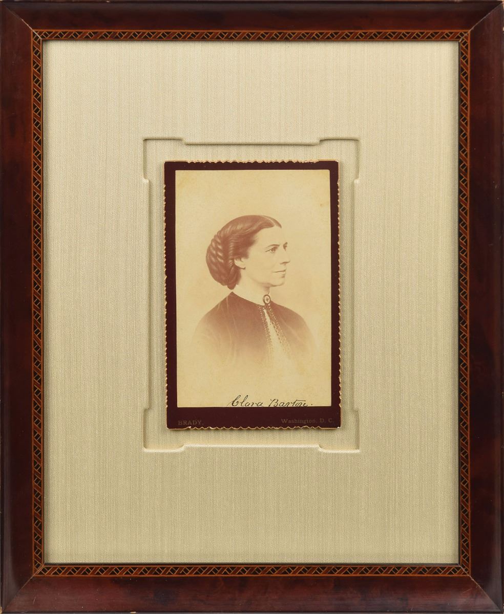 Teacher and humanitarian (1821–1912) best known for organizing the relief organization the American Red Cross. Exceptional 4.25 x 6.5 gilt-edged cabinet photo of Barton in a head-and-shoulders pose and wearing a Red Cross collar pin, boldly signed at the bottom of the image in black ink. Published by Mathew Brady of Washington, D.C. Cloth-matted and framed to an overall size of 12 x 14.75. In fine condition. A simply stunning portrait of this influential figure.