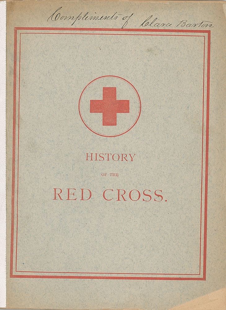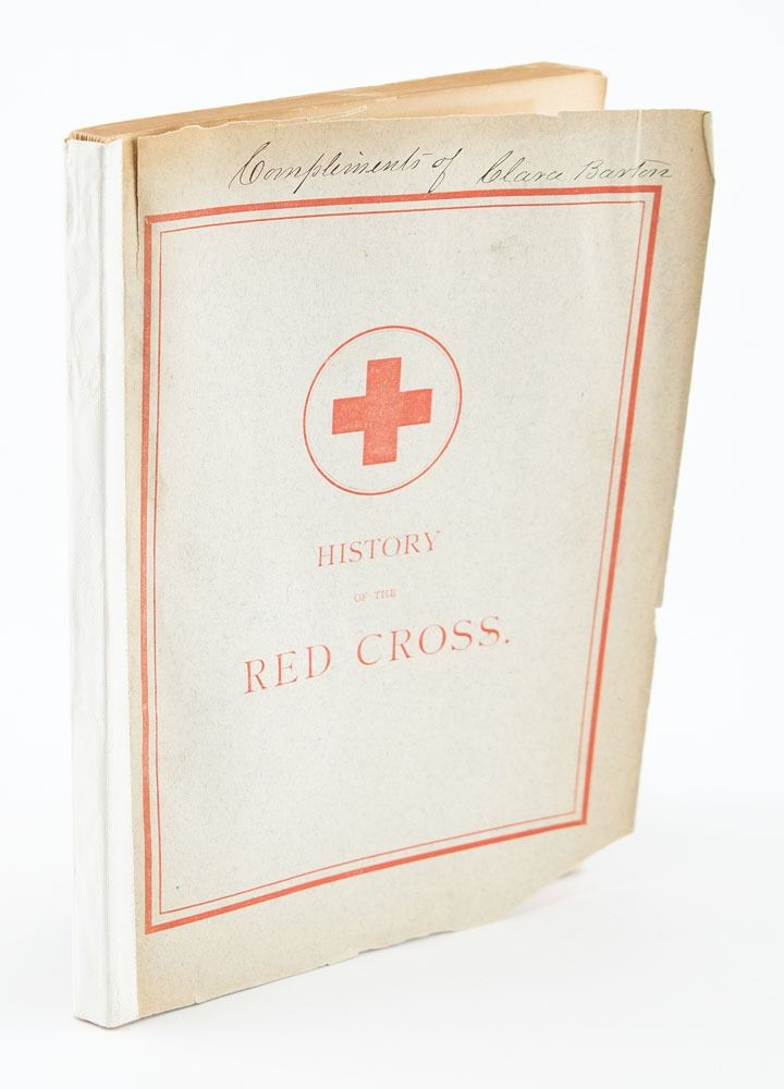 Signed book: History of the Red Cross. Washington: Government Printing Office, 1883. Paperback, 6.5 x 8.75, 227 pages. Signed on the front cover in black ink, "Compliments of Clara Barton." Housed in a custom clamshell case. In very good to fine condition, with edge toning, a block of toning to the title page, and a missing lower right corner tip.