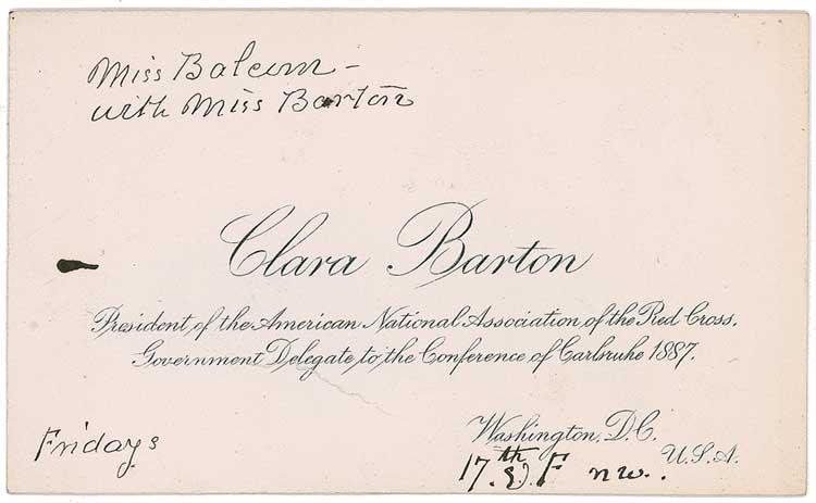 Barton’s personal calling card, as president of the American Red Cross, 4 x 2.5, signed in the upper left, “Miss Baleum—with Miss Barton,” and adding “Fridays,” in the lower left. Adhesive remnants to reverse, diagonal crease through small portion of signature, and a couple other creases, and ink notation to bottom, otherwise fine condition. RRAuction COA.