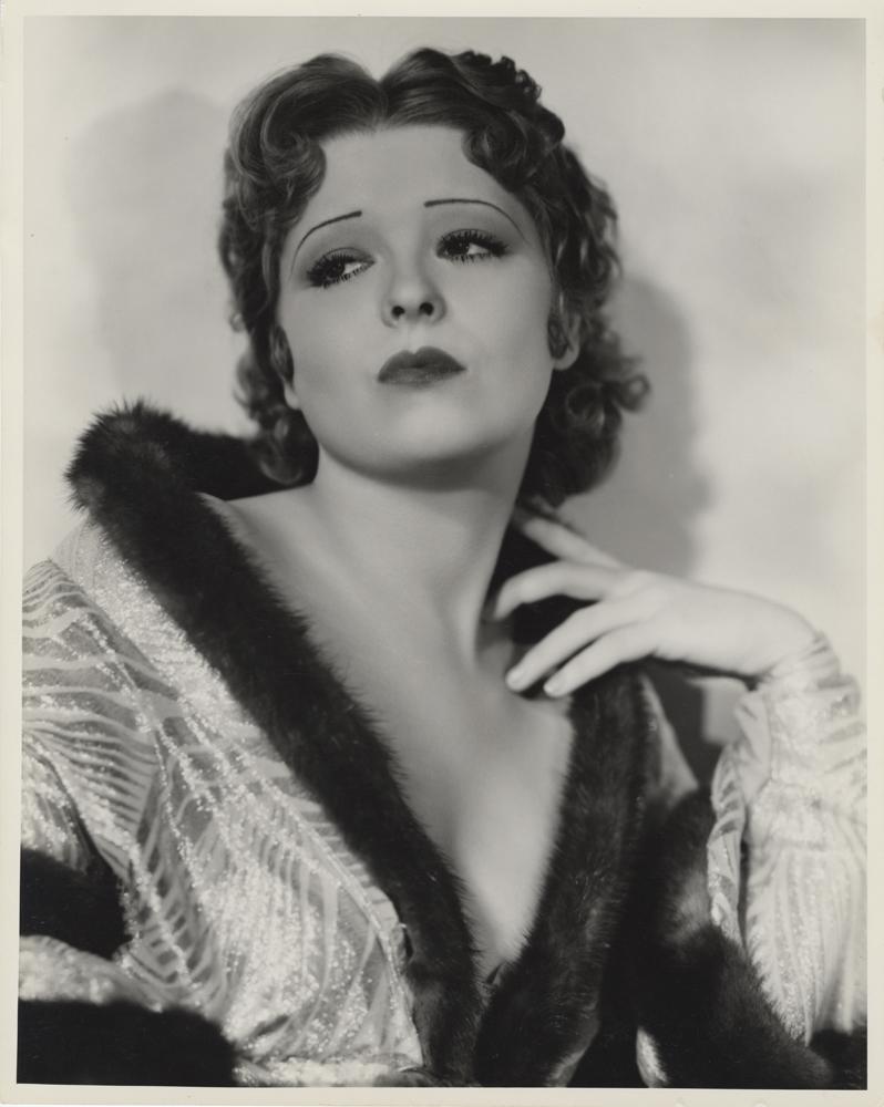 (Fox Film, 1932) Gelatin silver glossy double-weight 11 x 14 in. print of Clara Bow from Call Her Savage by Hal Phyfe; with photographer and Fox Film rubber stamps on the verso. Fine; with handling at the lower right and left and light impression marks at the lower center.