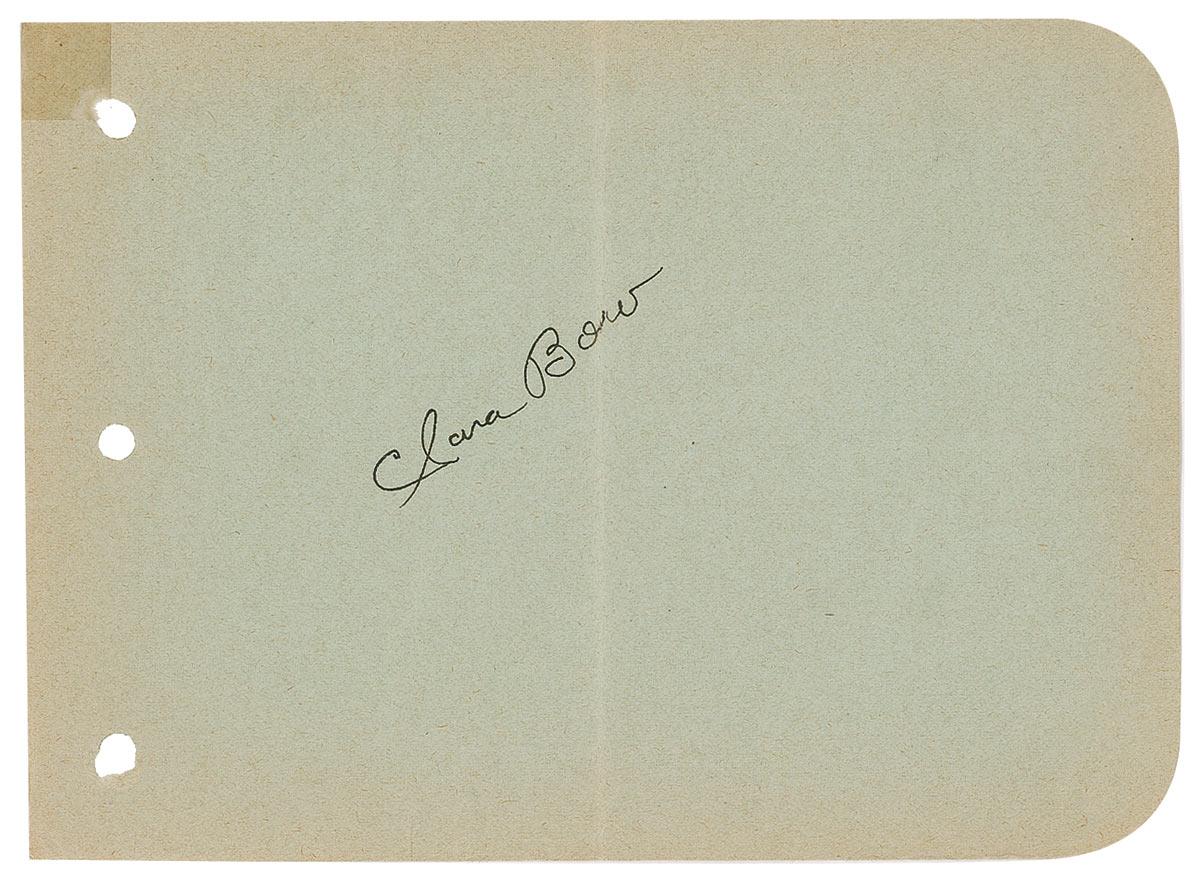 Vintage fountain pen signature, “Clara Bow,” on a light green 6 x 4.5 album page. In fine condition, with a central vertical fold through a single letter of signature, some light edge toning, and a tape remnant to top left corner.